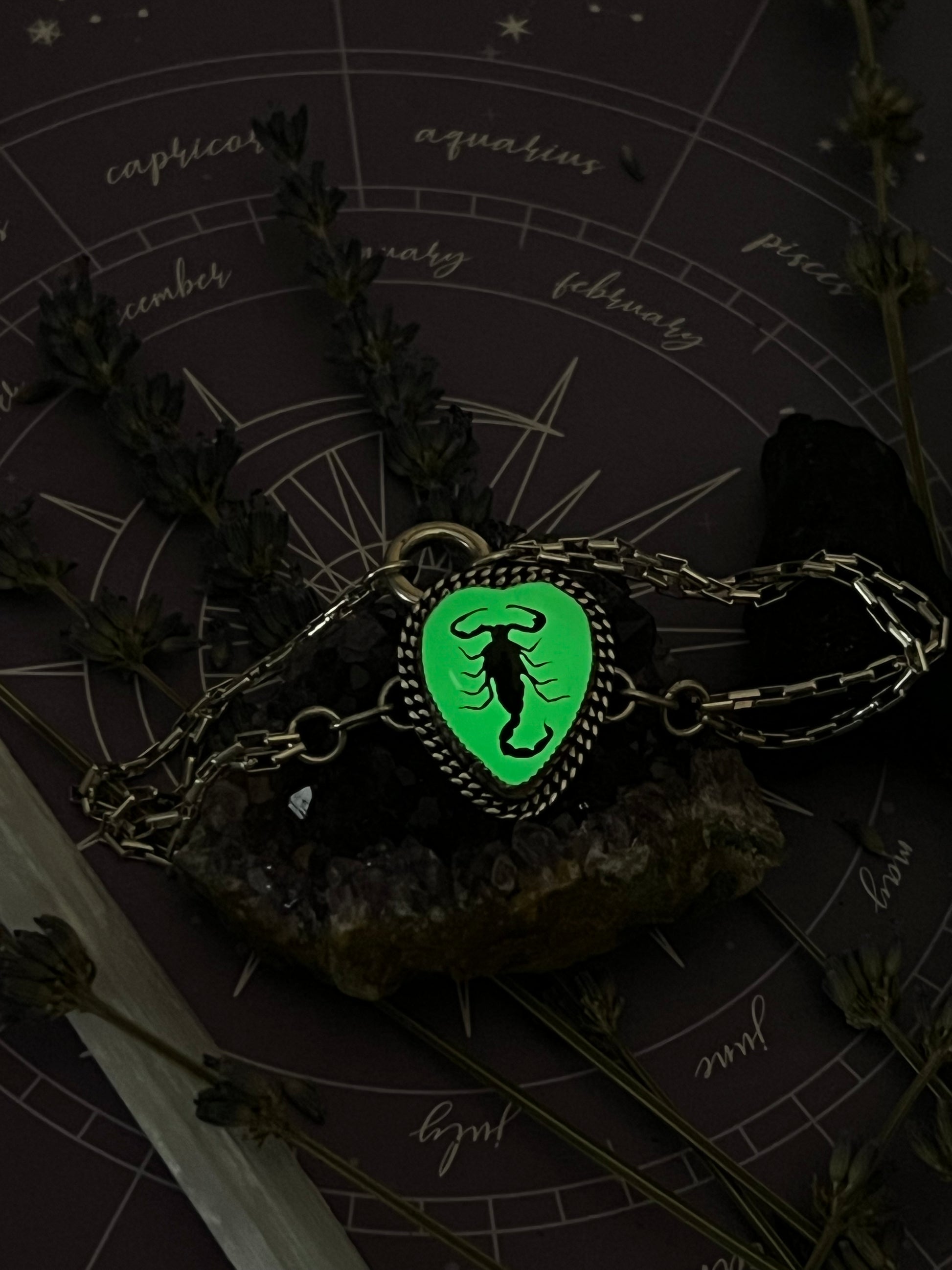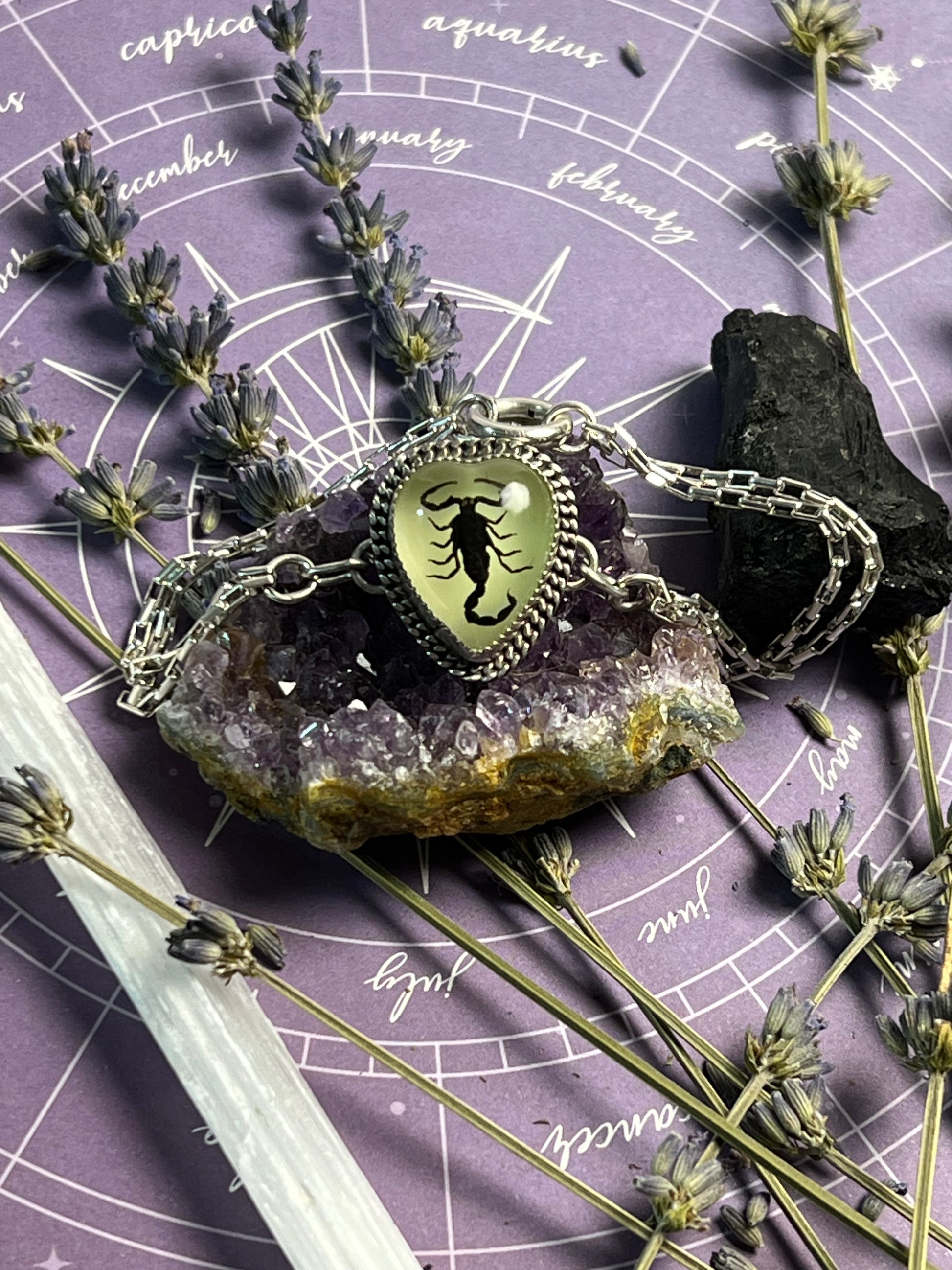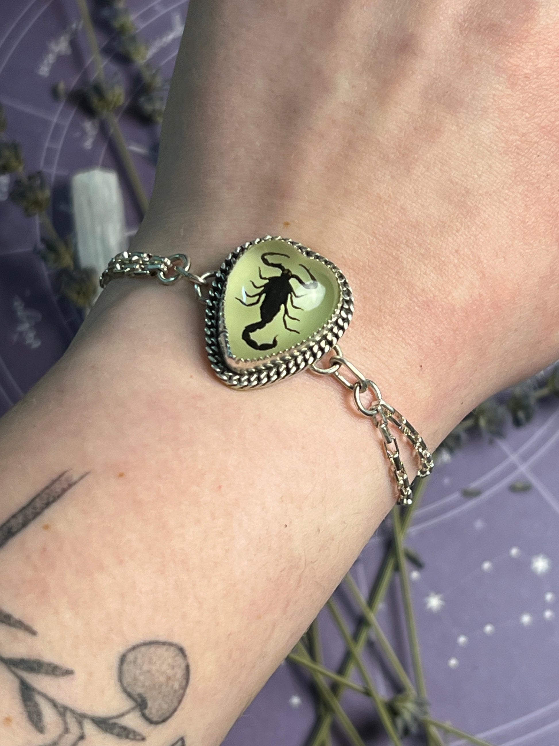 The bracelet features a scorpion preserved in green glow-in-the-dark acrylic set in silver surrounded by Miami cuban link chain. The bracelet measures 8 3/4 inches long.