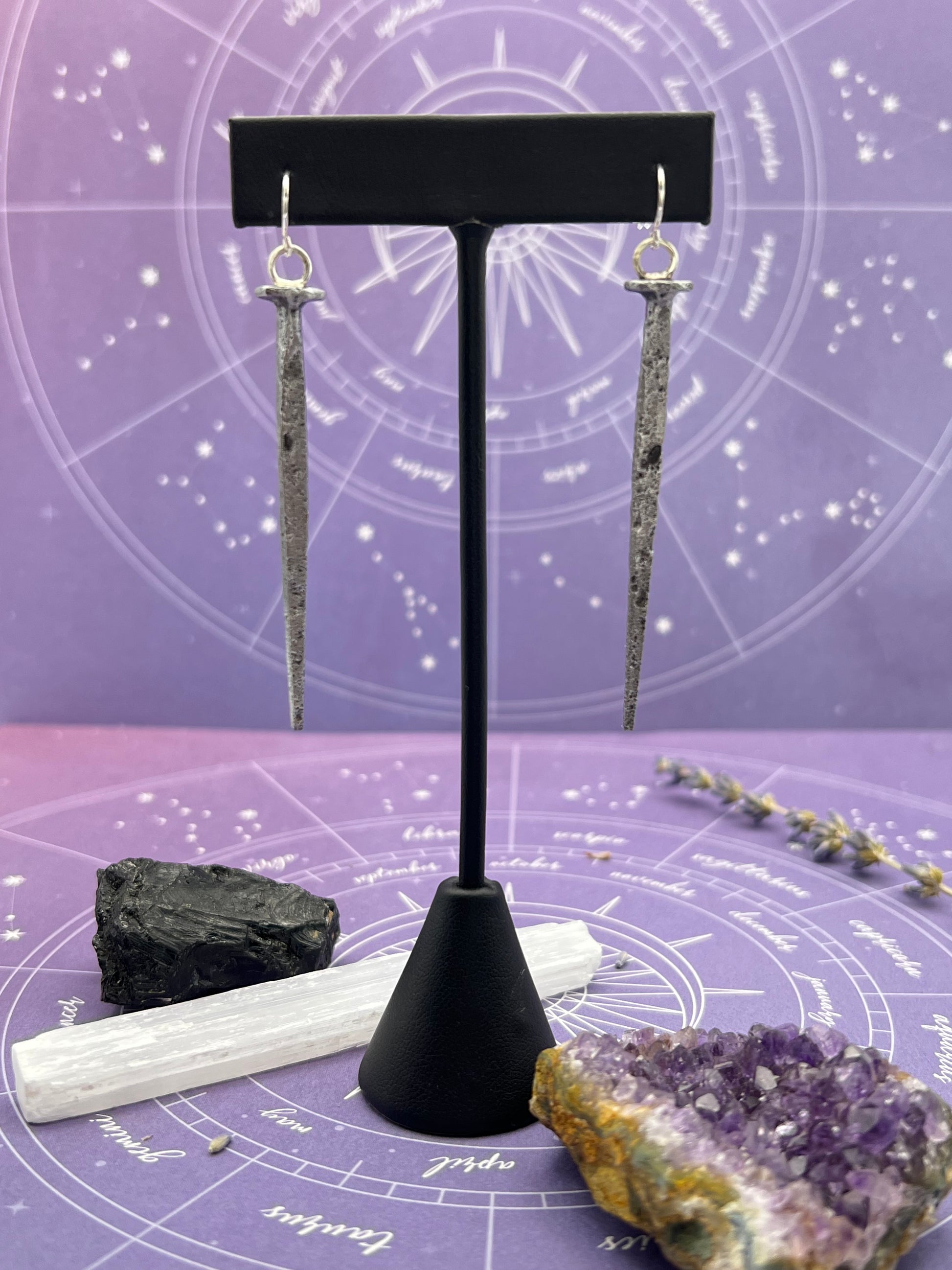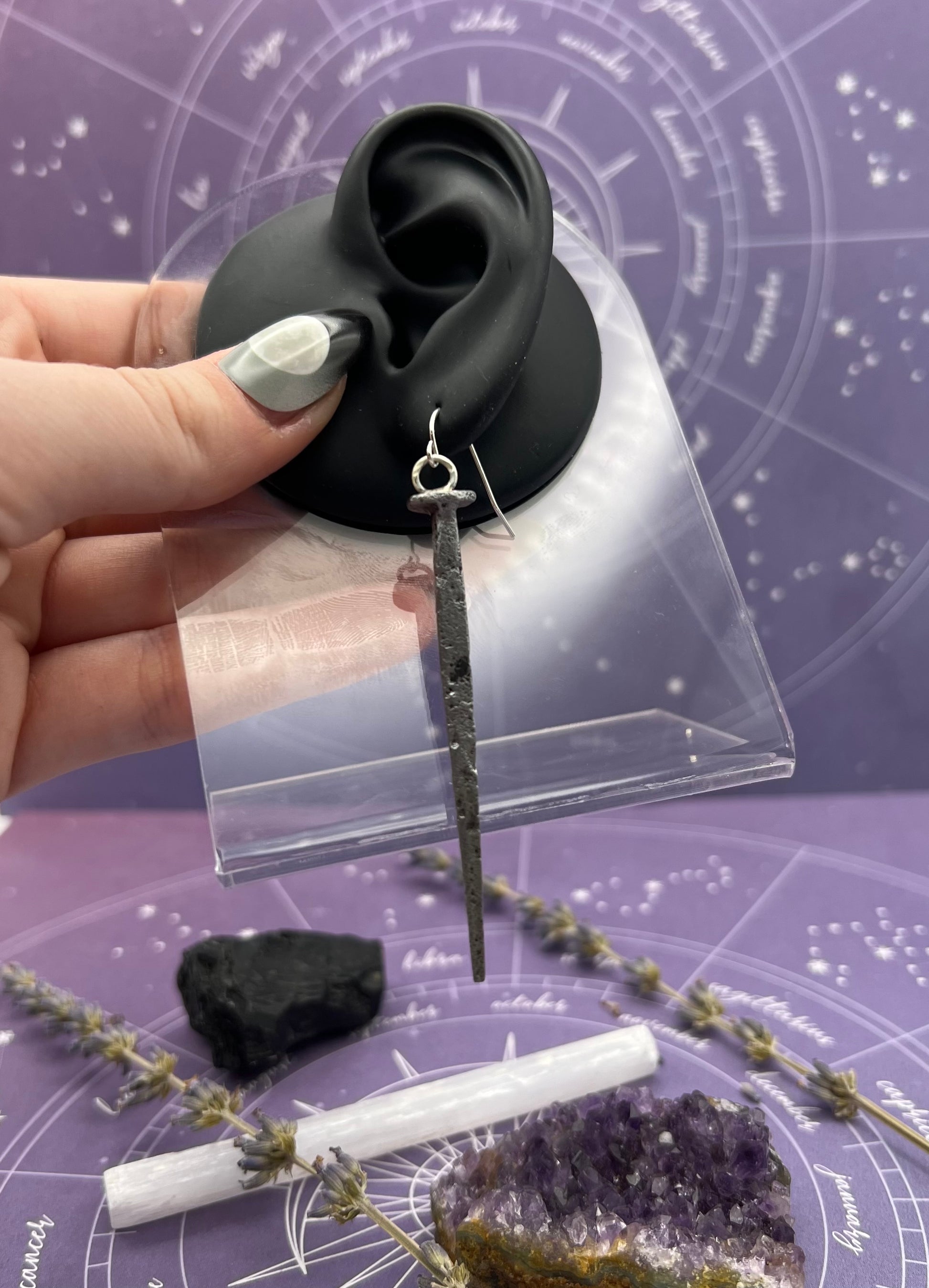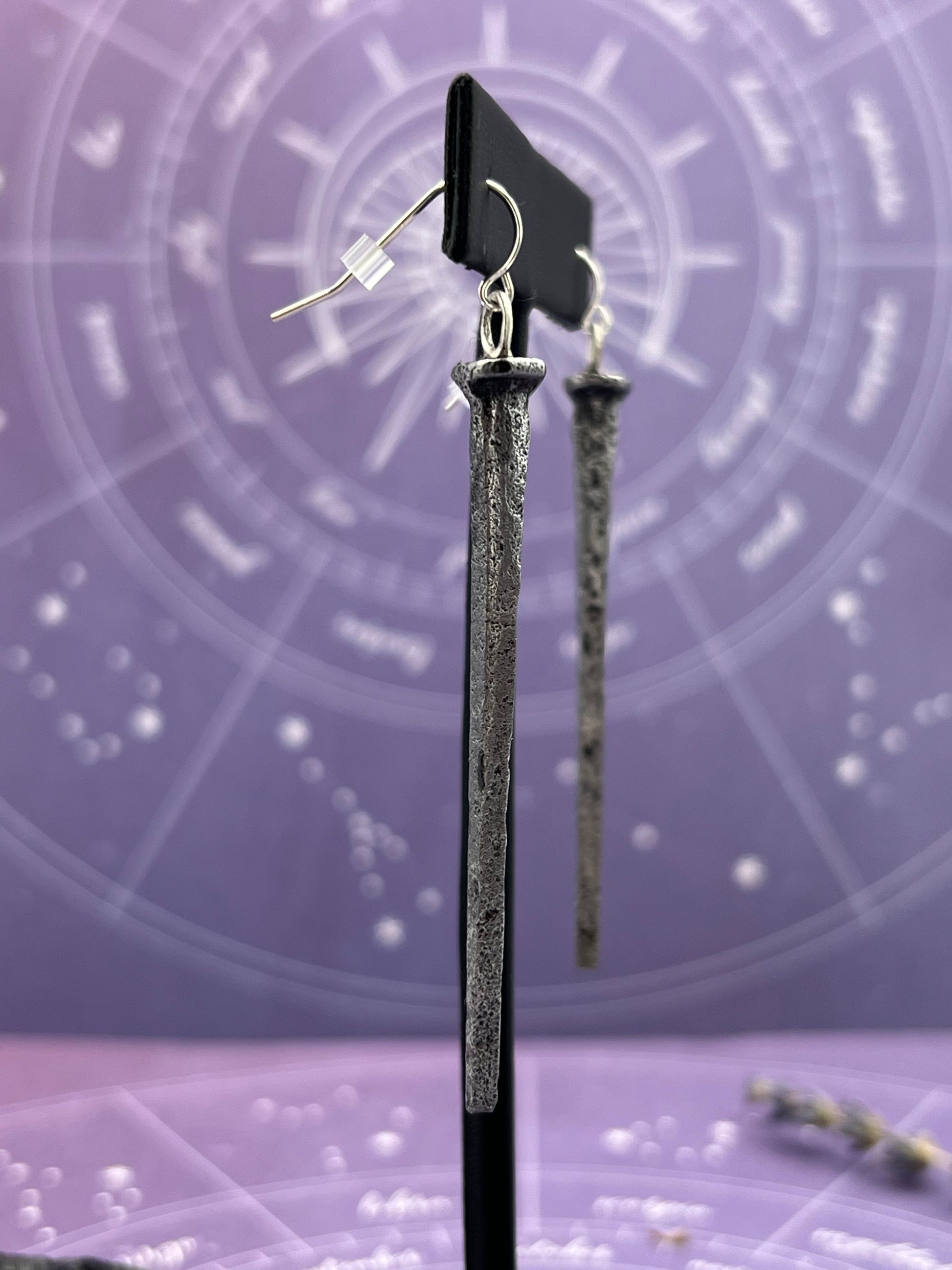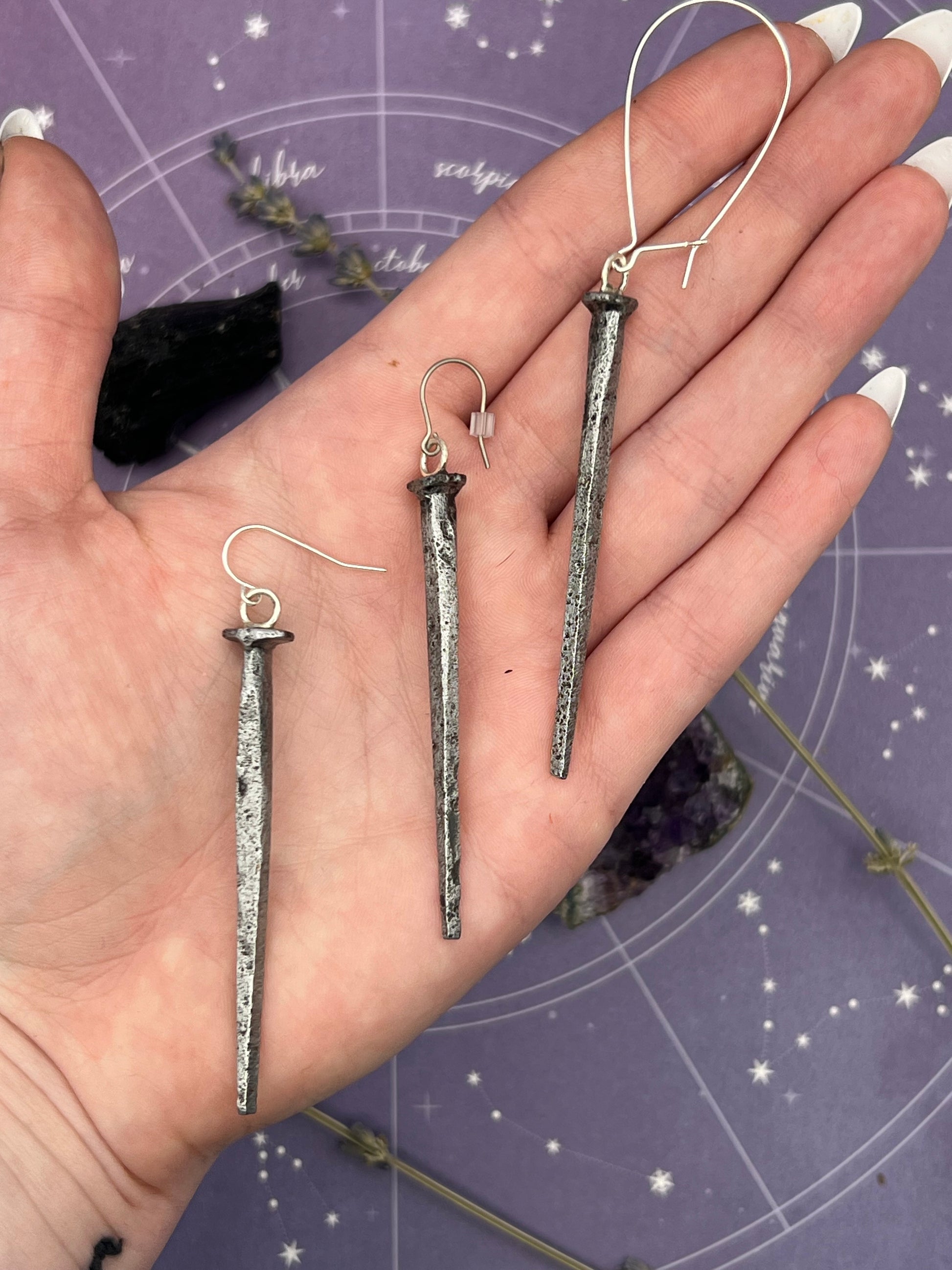 These earrings feature antique Victorian era "coffin" nails that were hand forged from iron, sourced from Salem, Massachusetts. Coffin refers to the shape and style of nail, and they would be used in the making of coffins and the building of other items.
