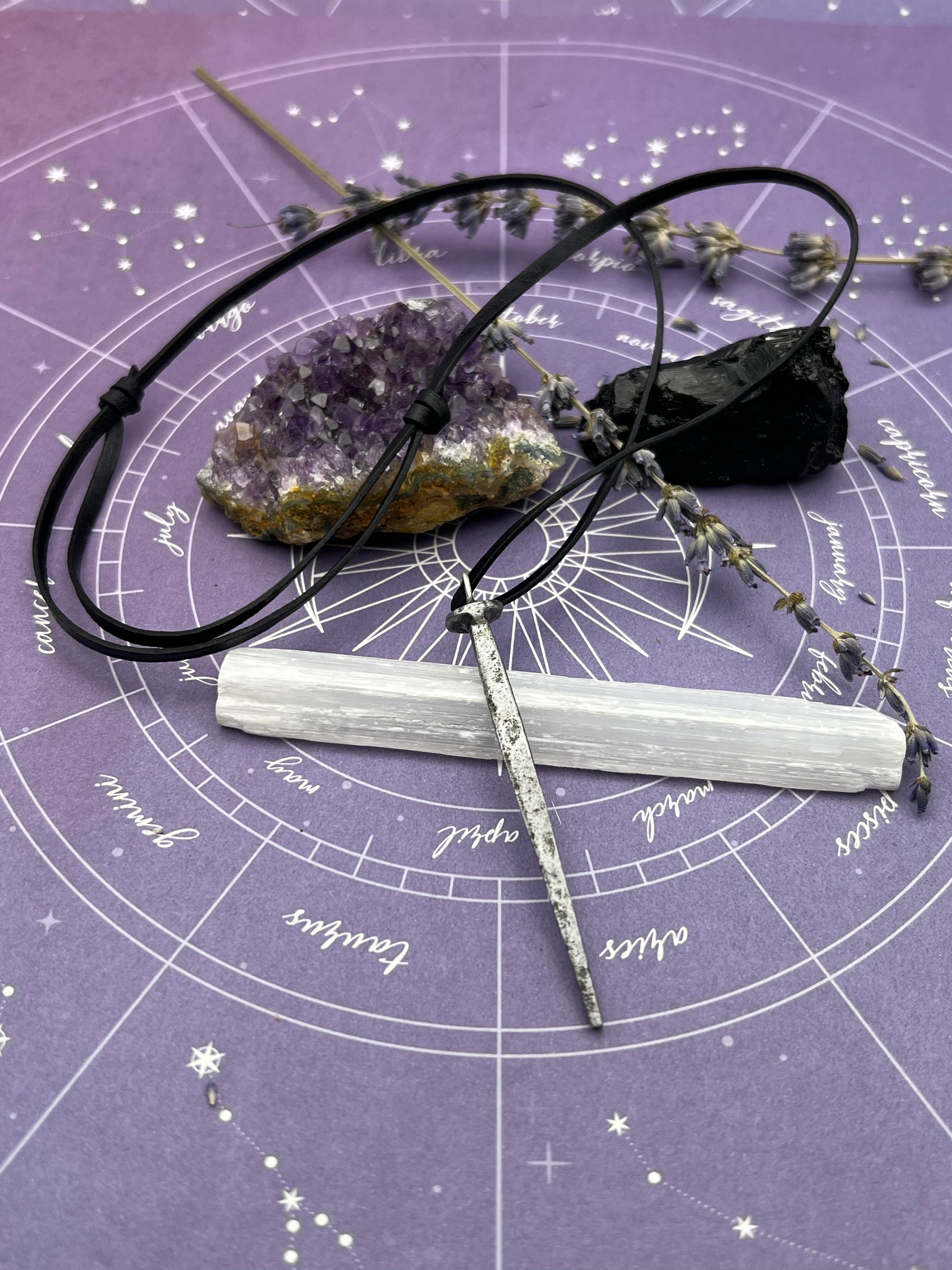 This necklace features an antique Victorian era "coffin" nail pendant that was hand forged from iron, and sourced from Salem, Massachusetts. Coffin refers to the shape and style of nail, and they would be used in the making of coffins and the building of other items. The nail measures about 2 1/2 inches long, and hangs on an adjustable leather necklace that goes up to 24 inches long.