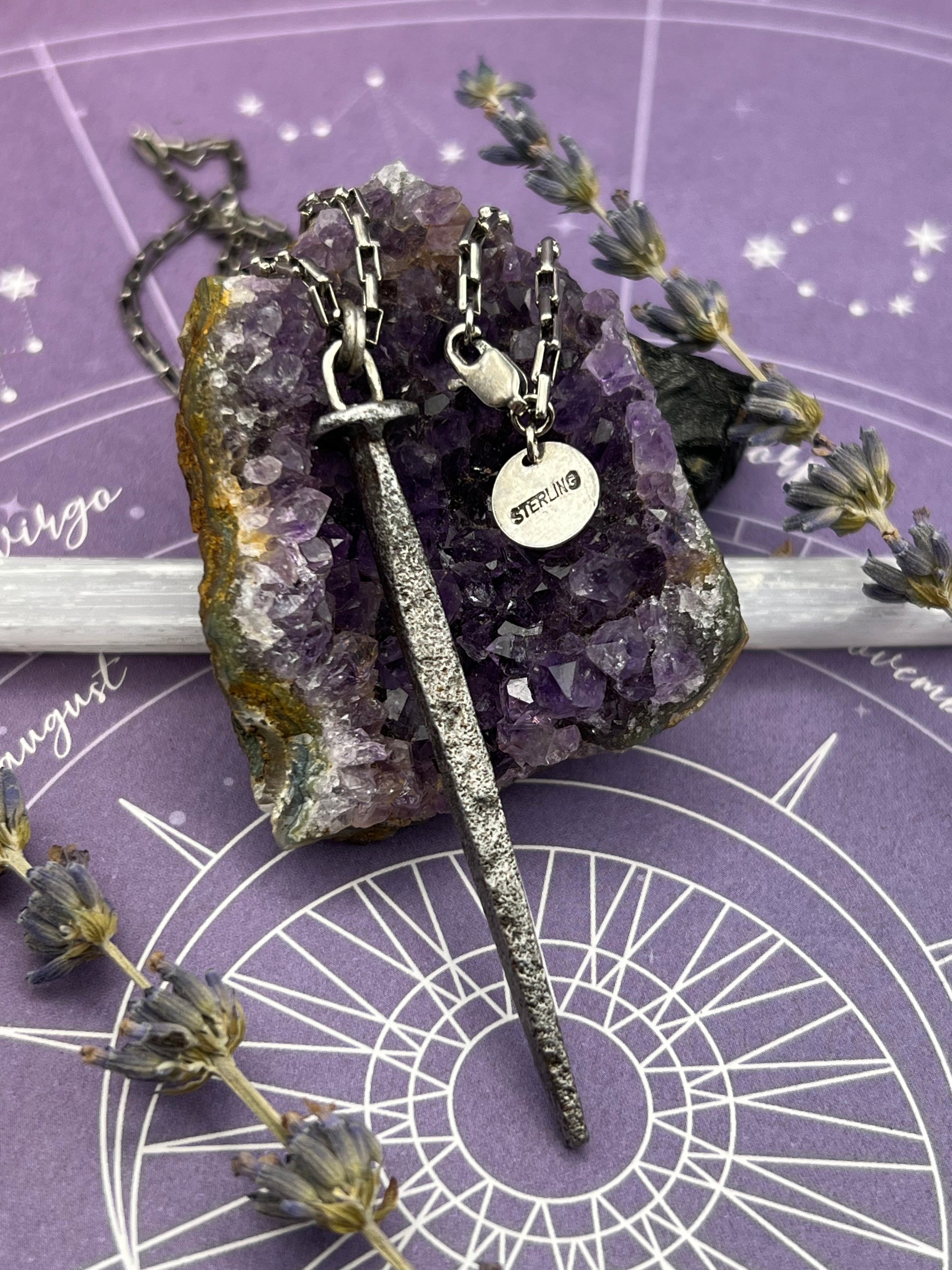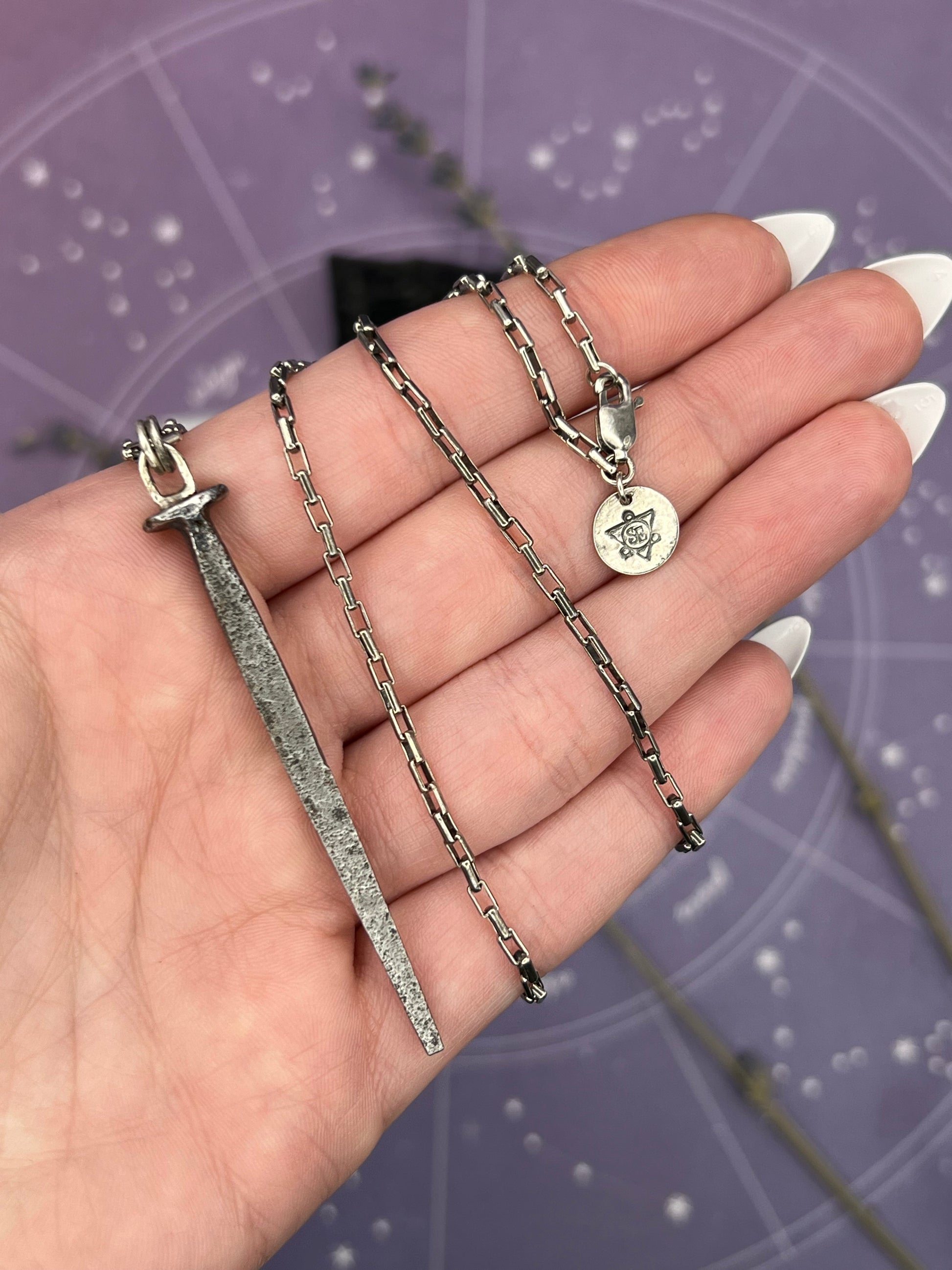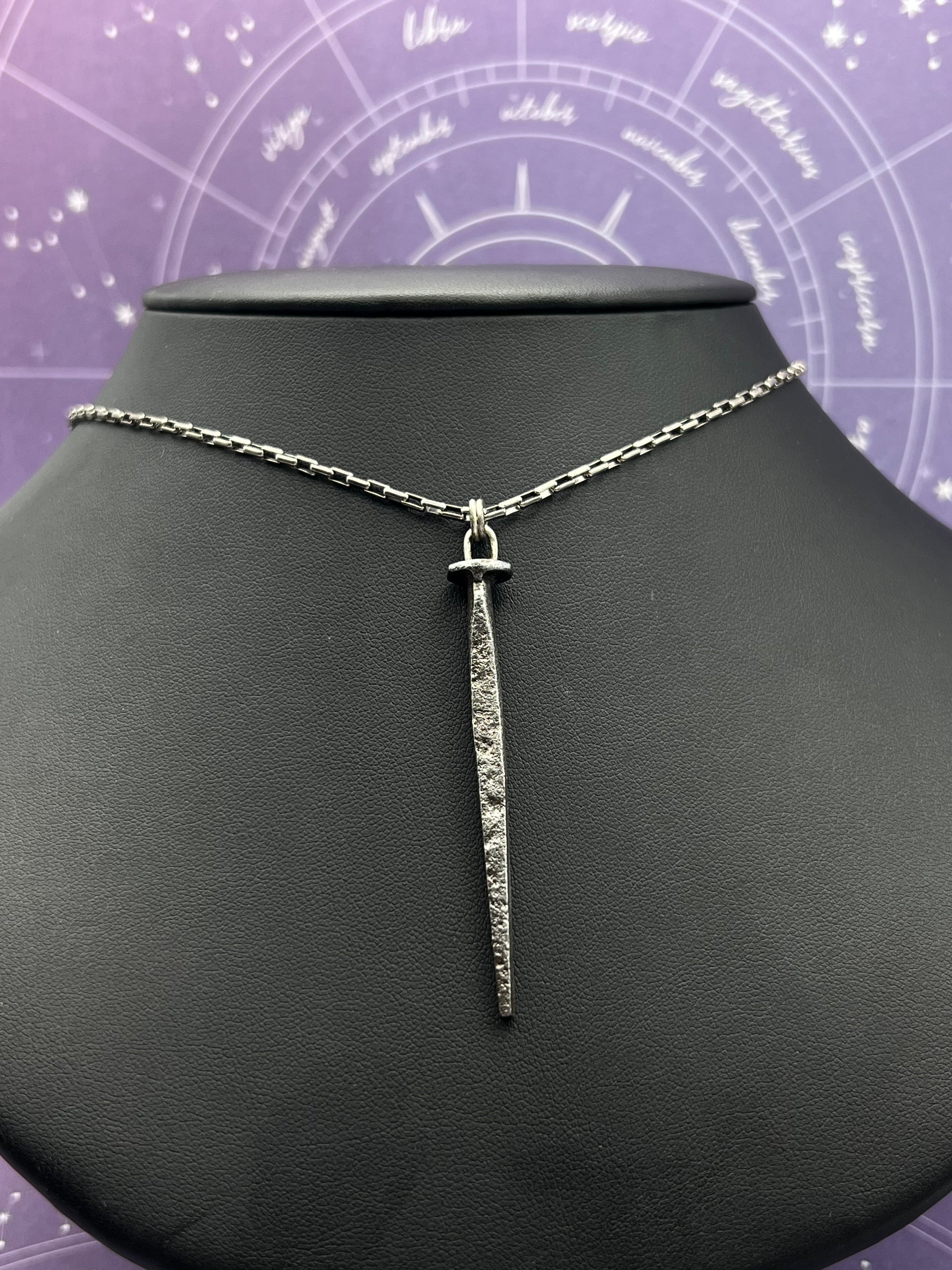 This necklace features an antique Victorian era "coffin" nail pendant that was hand forged from iron, and sourced from Salem, Massachusetts. Coffin refers to the shape and style of nail, and they would be used in the making of coffins and the building of other items. The nail measures about 2 1/2 inches long, and hangs on a 20 inch antiqued sterling silver chain