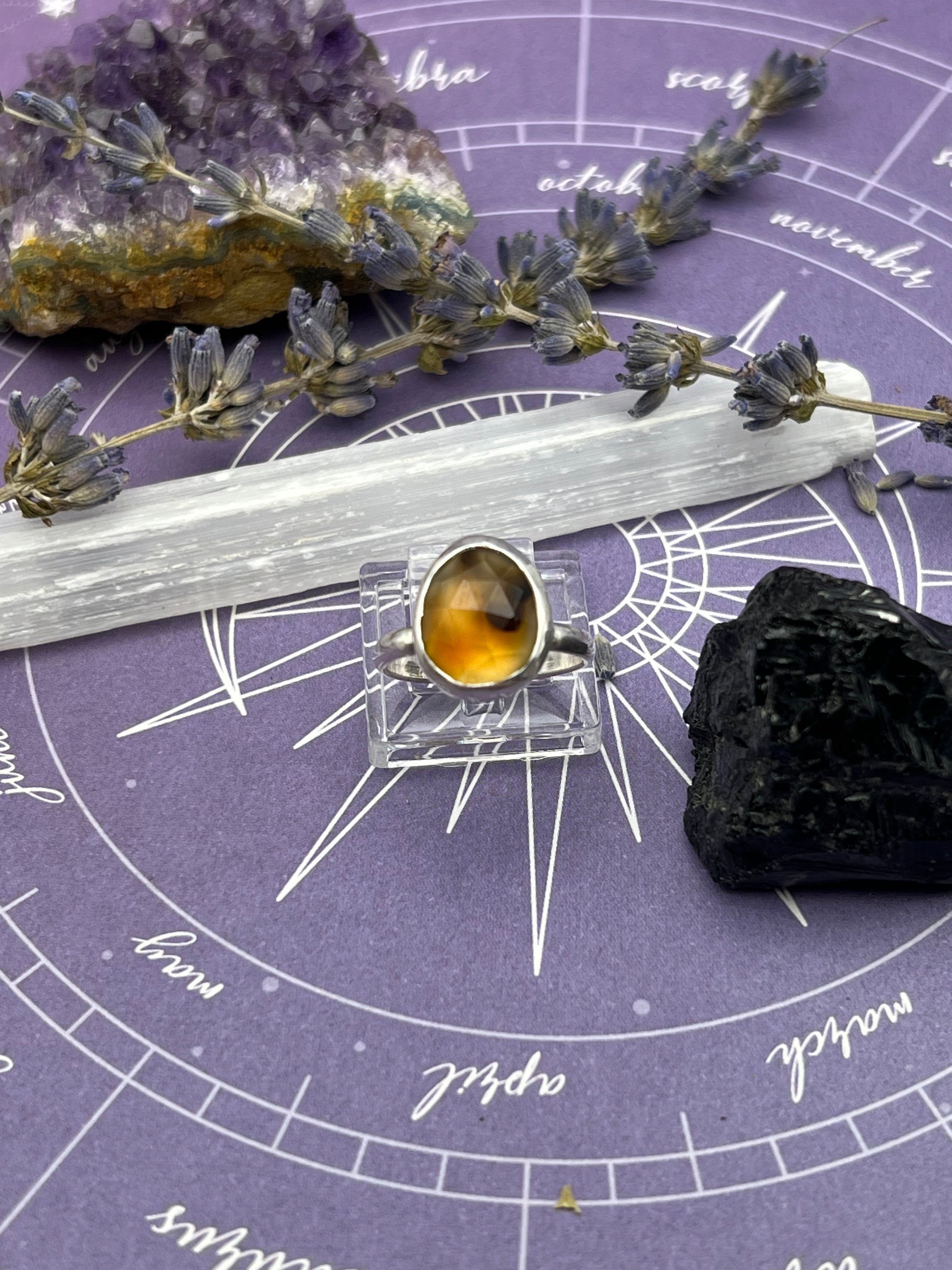 This ring features a faceted Montana agate set in sterling silver. It is a size 6 1/2.