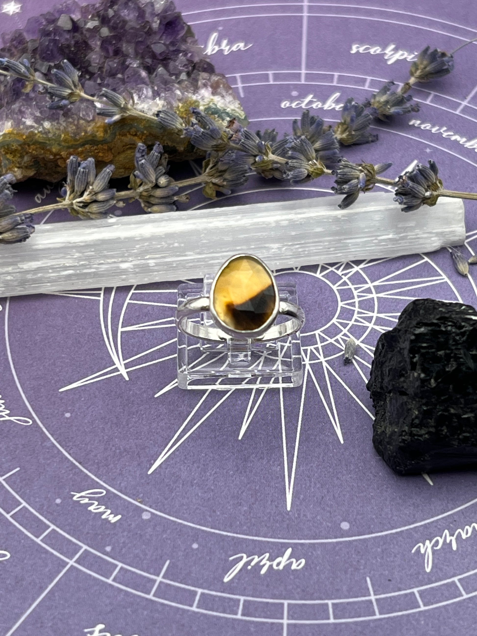 This ring features a faceted Montana agate set in sterling silver. It is a size 9.