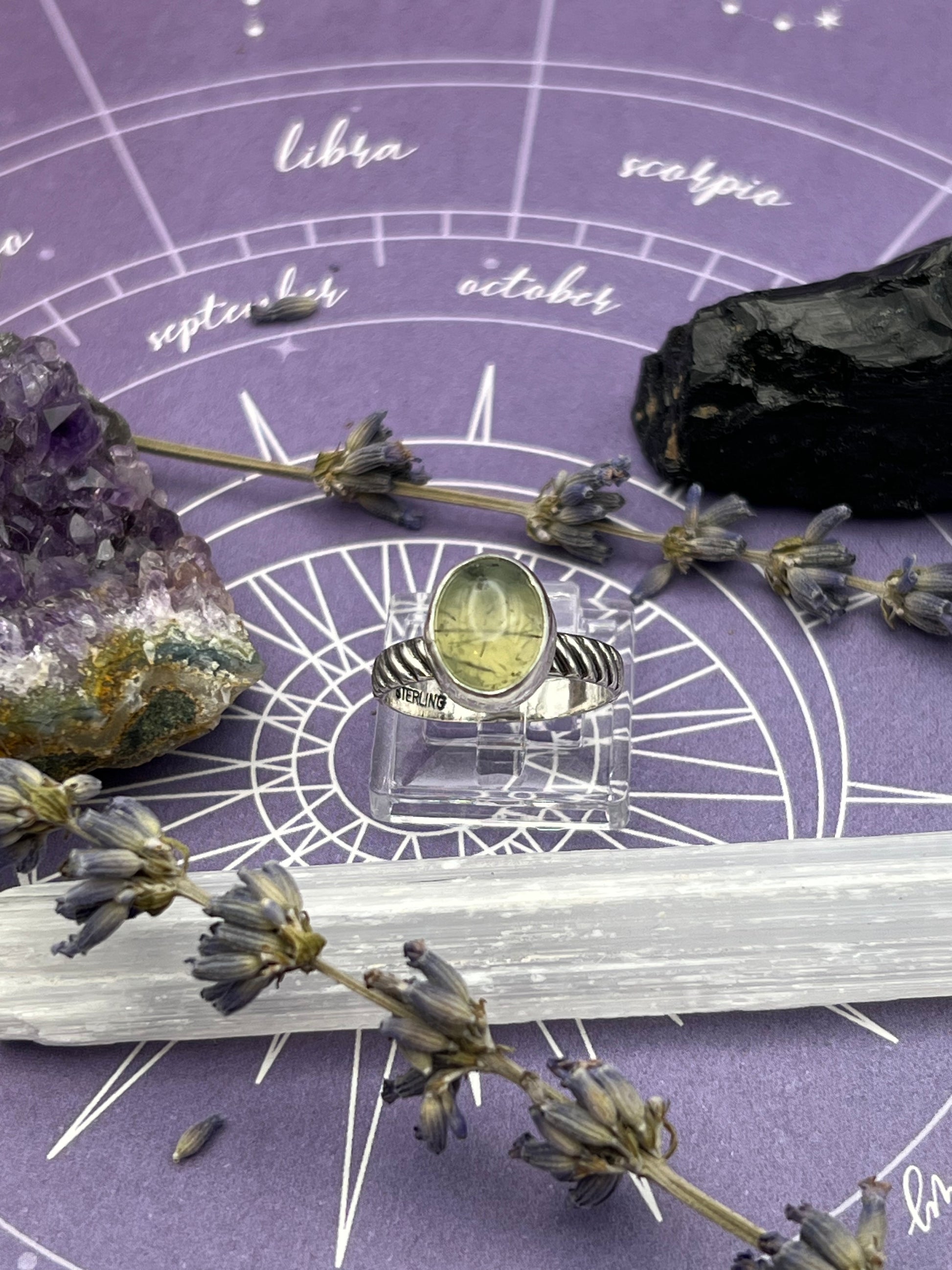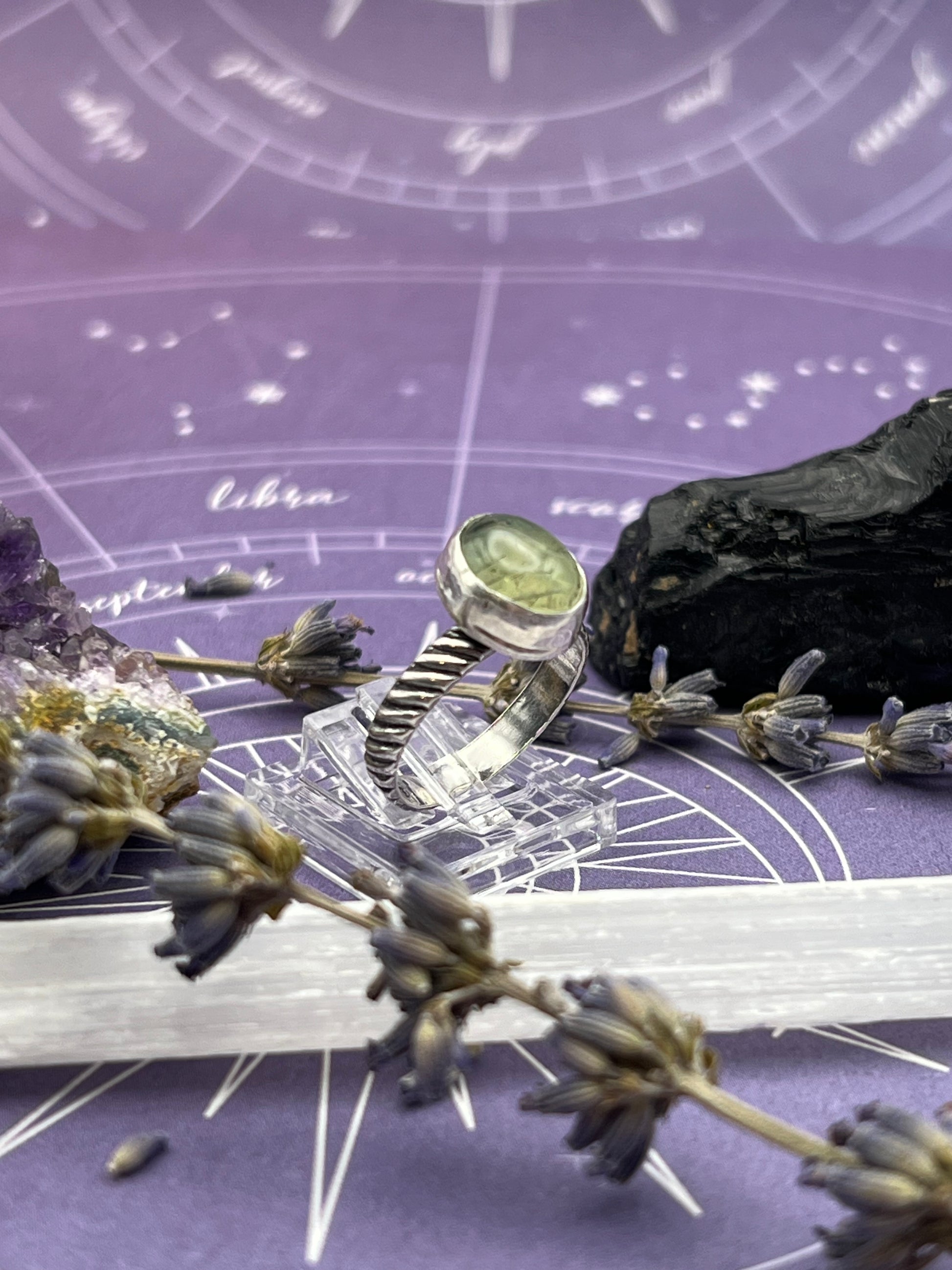 This handmade ring is crafted from sterling silver featuring an oval prehnite with epidote inclusions. It is a size 7 1/2.