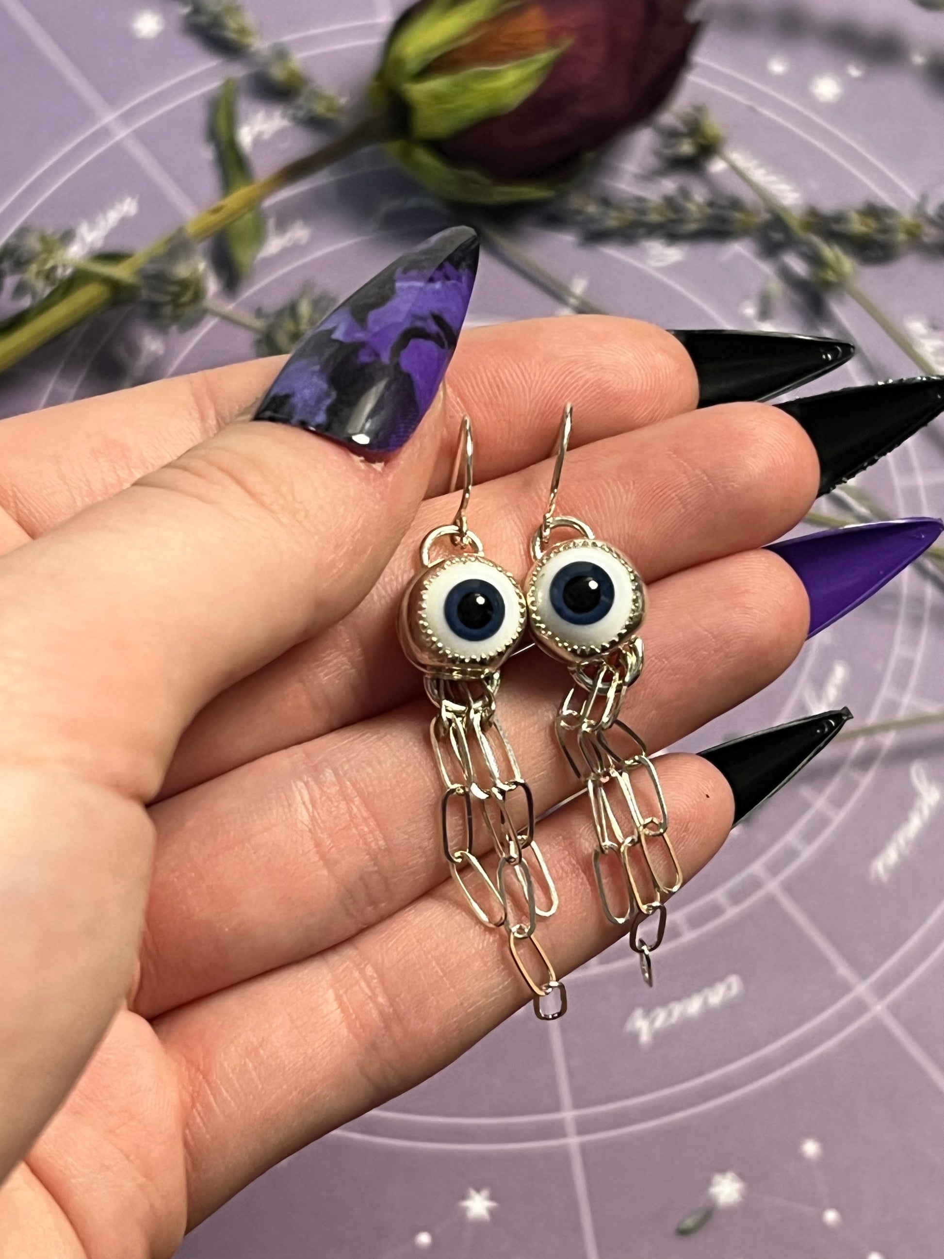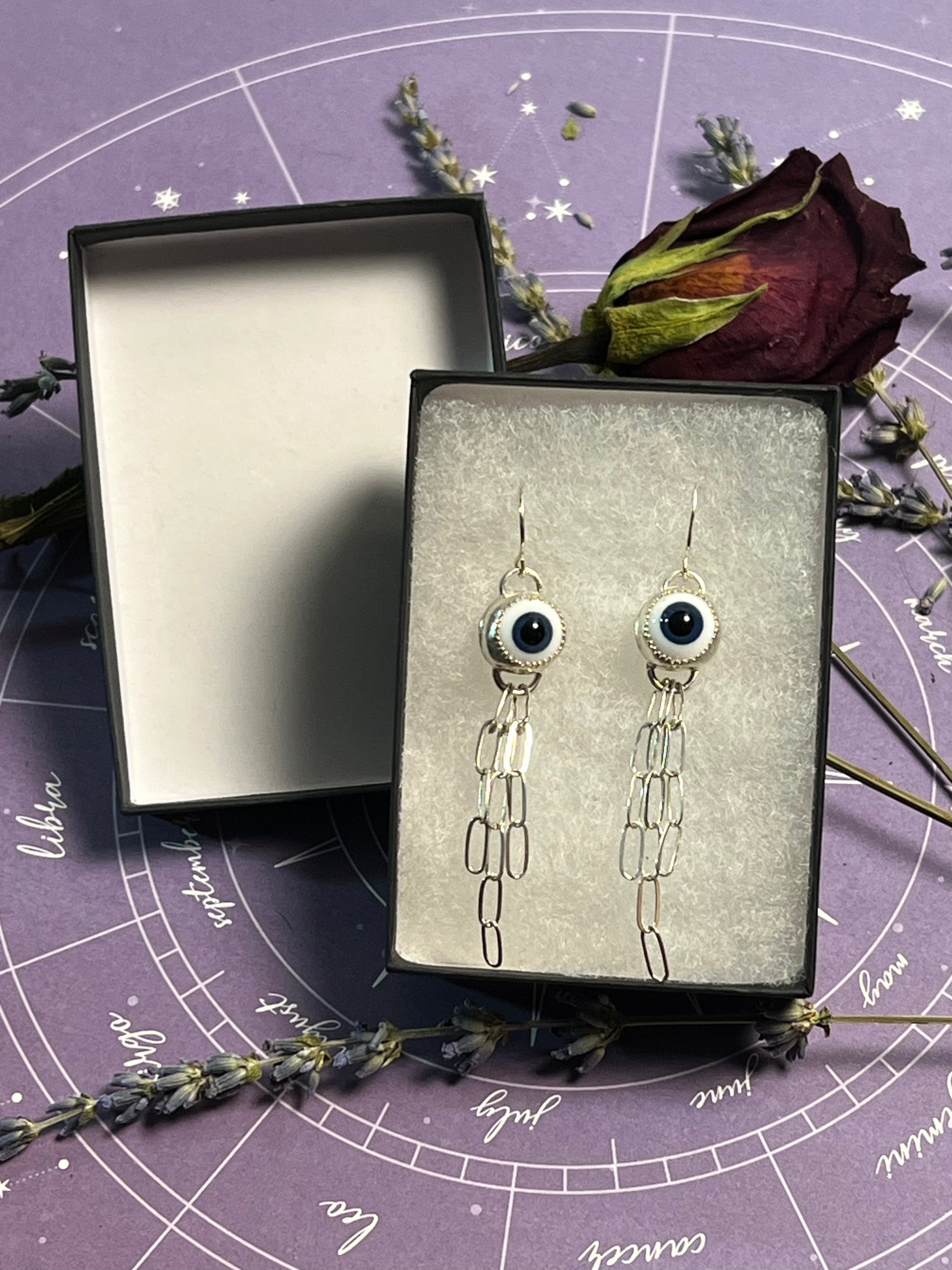 The all seeing eye earrings are a solid sterling silver construction and they measure 2 1/2 inches long at their longest point. The eye cabochons are handmade glass.