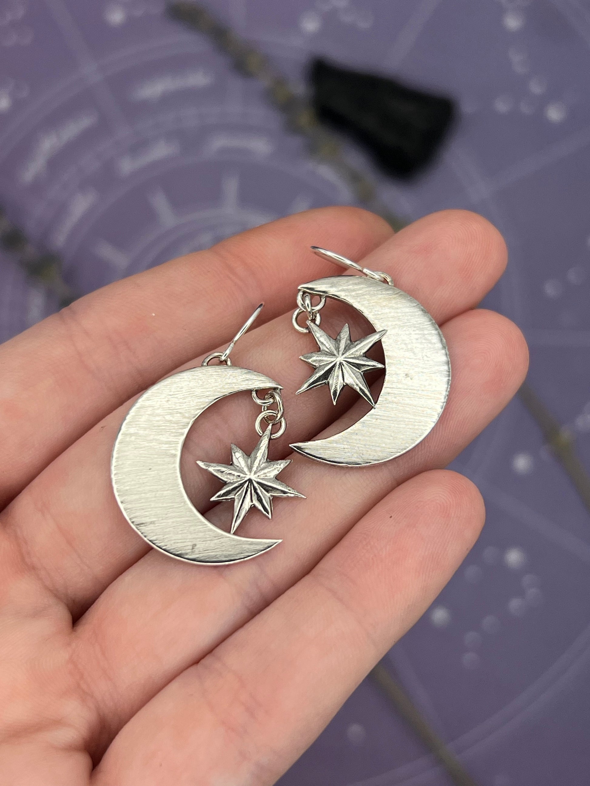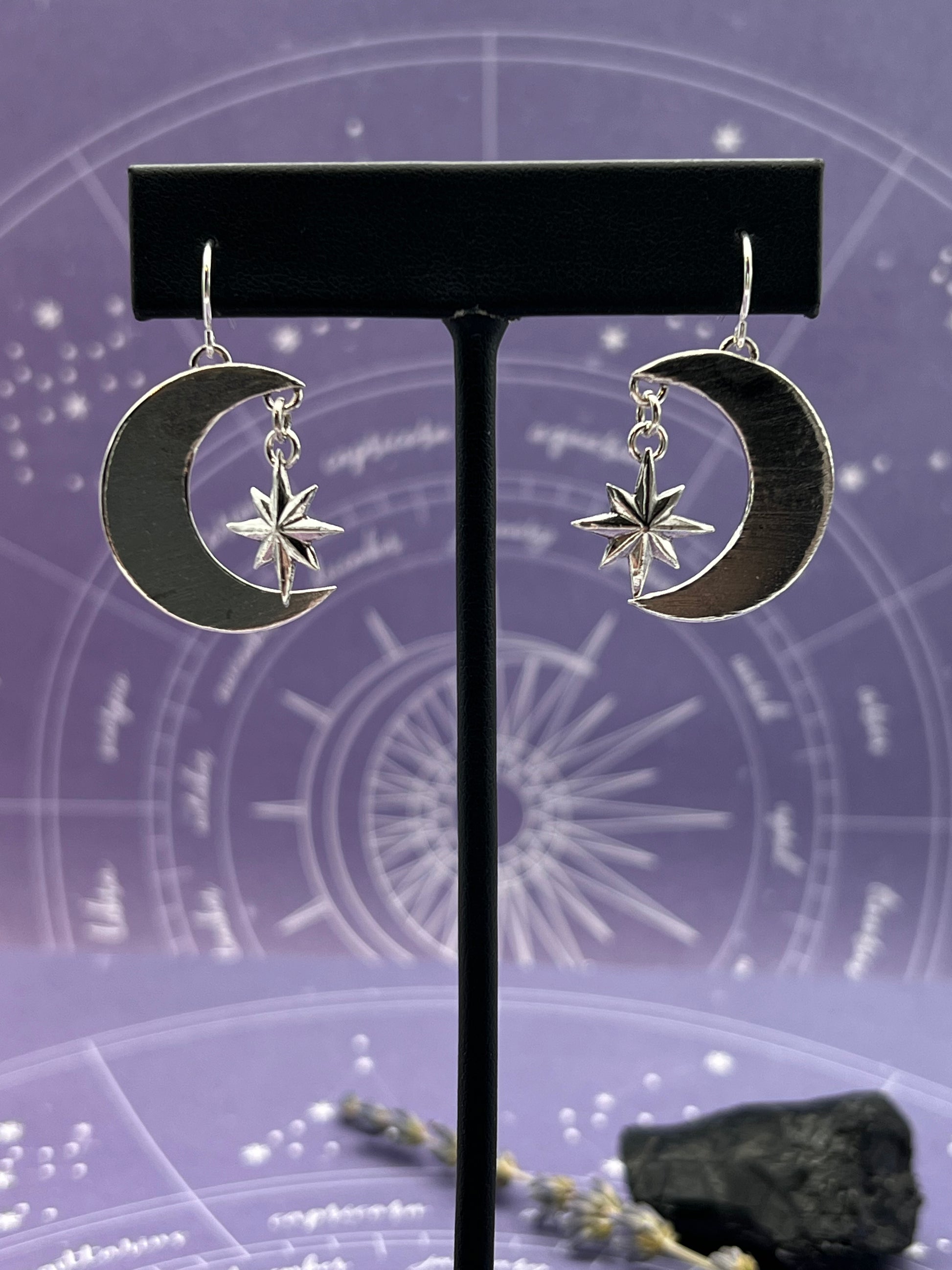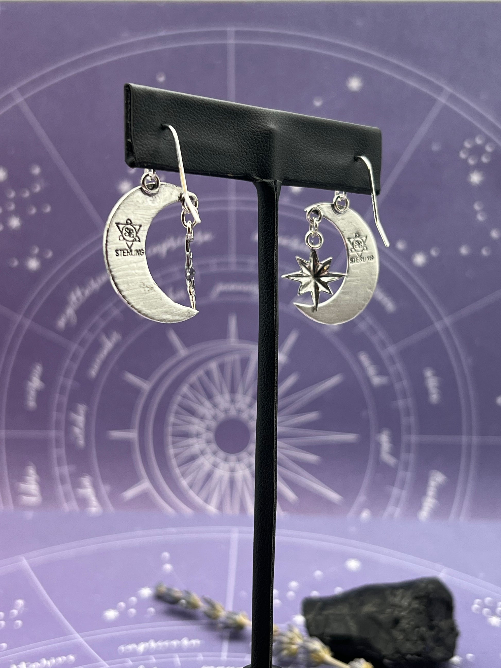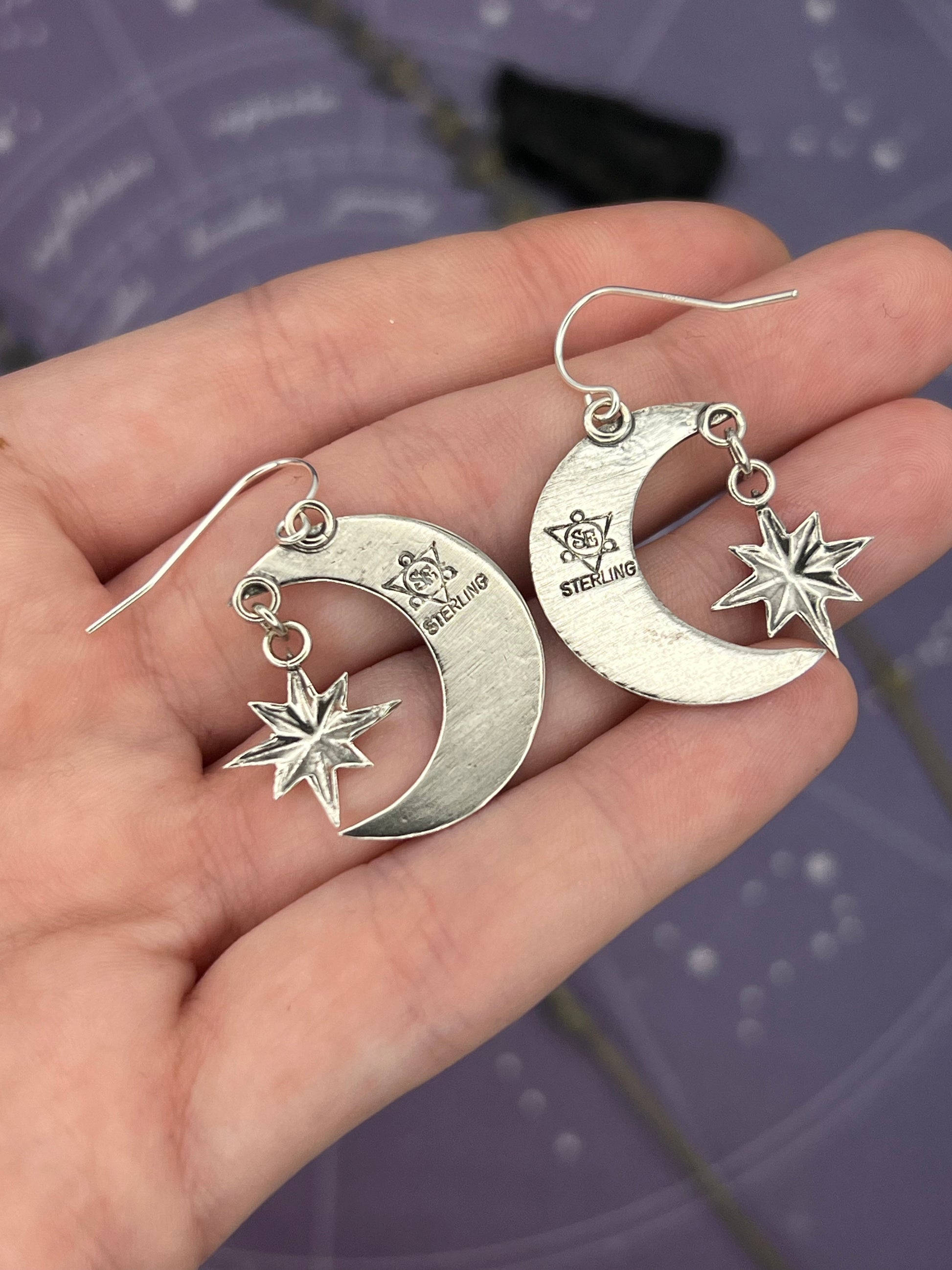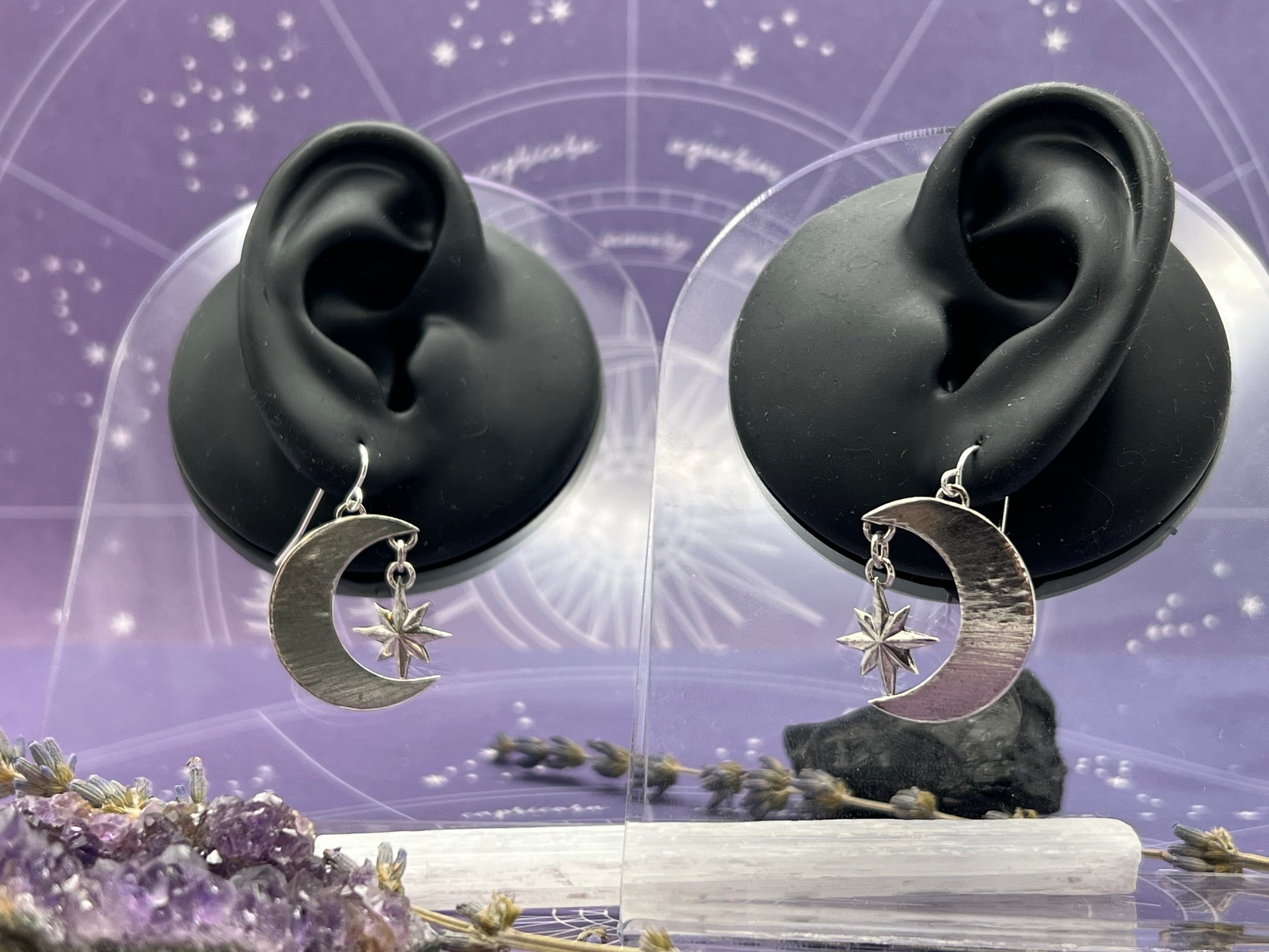 The silver Selene earrings, named after the Greek goddess of the moon, are completely handcrafted of sterling silver. They hang about 1 inch in length, and the star is on a chain so it can move freely and dance in the light.