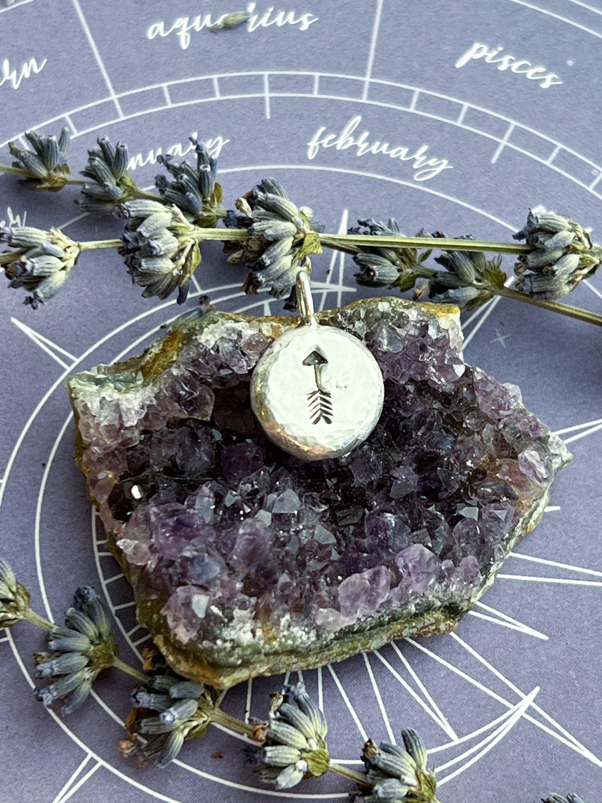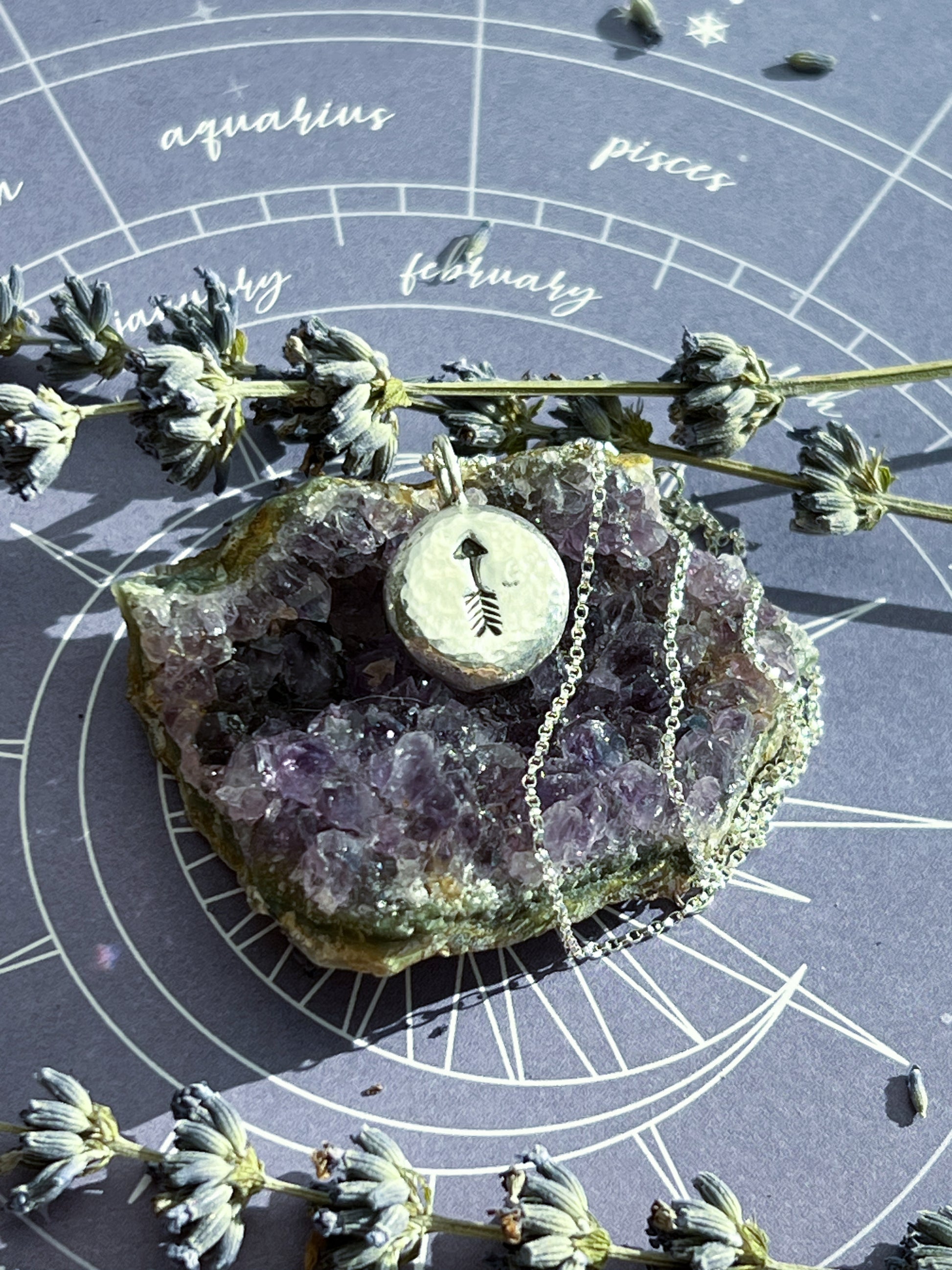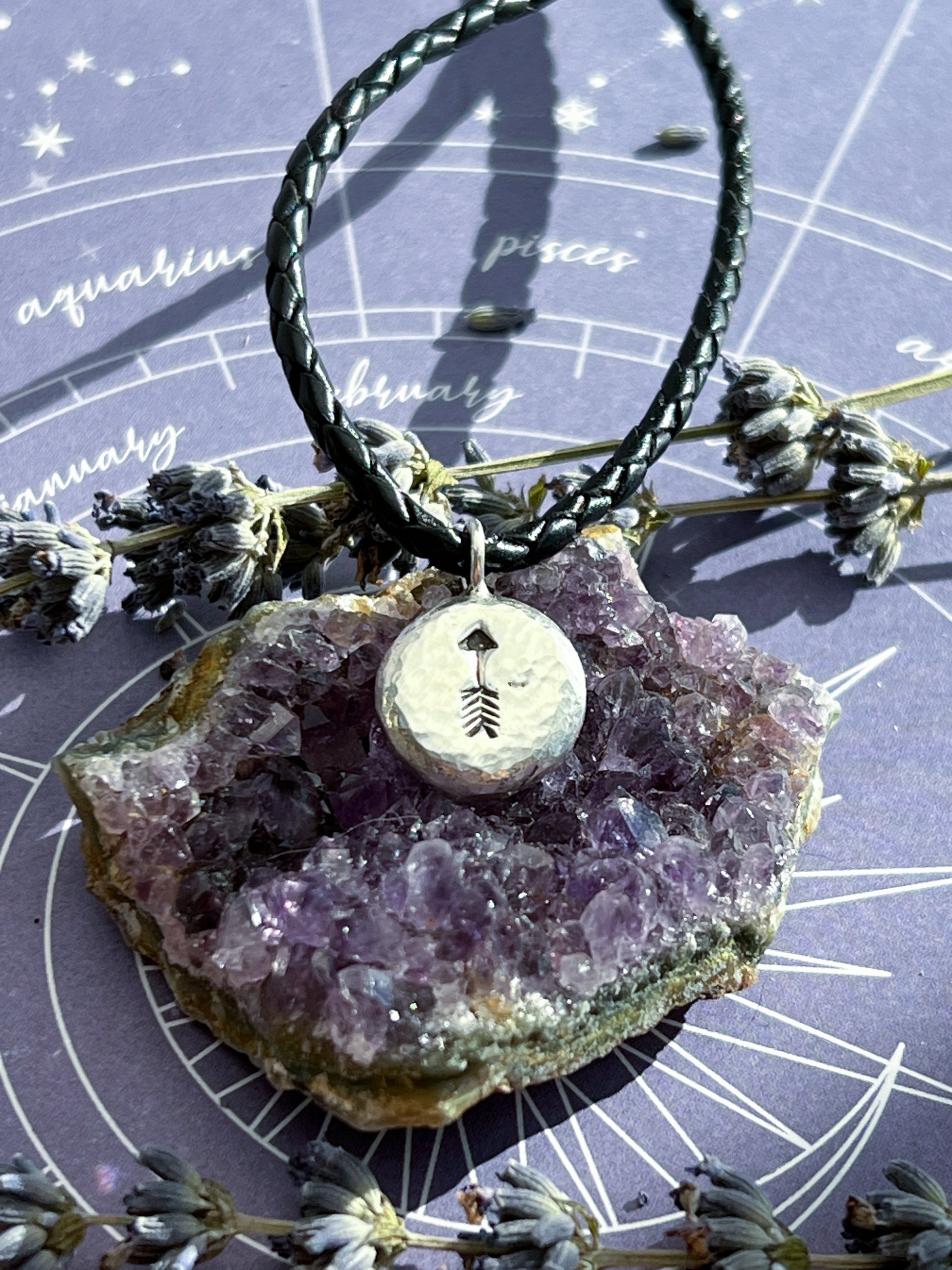 This pendant is made of 100% recycled sterling silver and has an organic, free-formed shape, and hammered finish. It is available as a pendant, or you can add a 2mm 20 inch black leather chain, or a 1mm 20 inch sterling silver rolo chain.