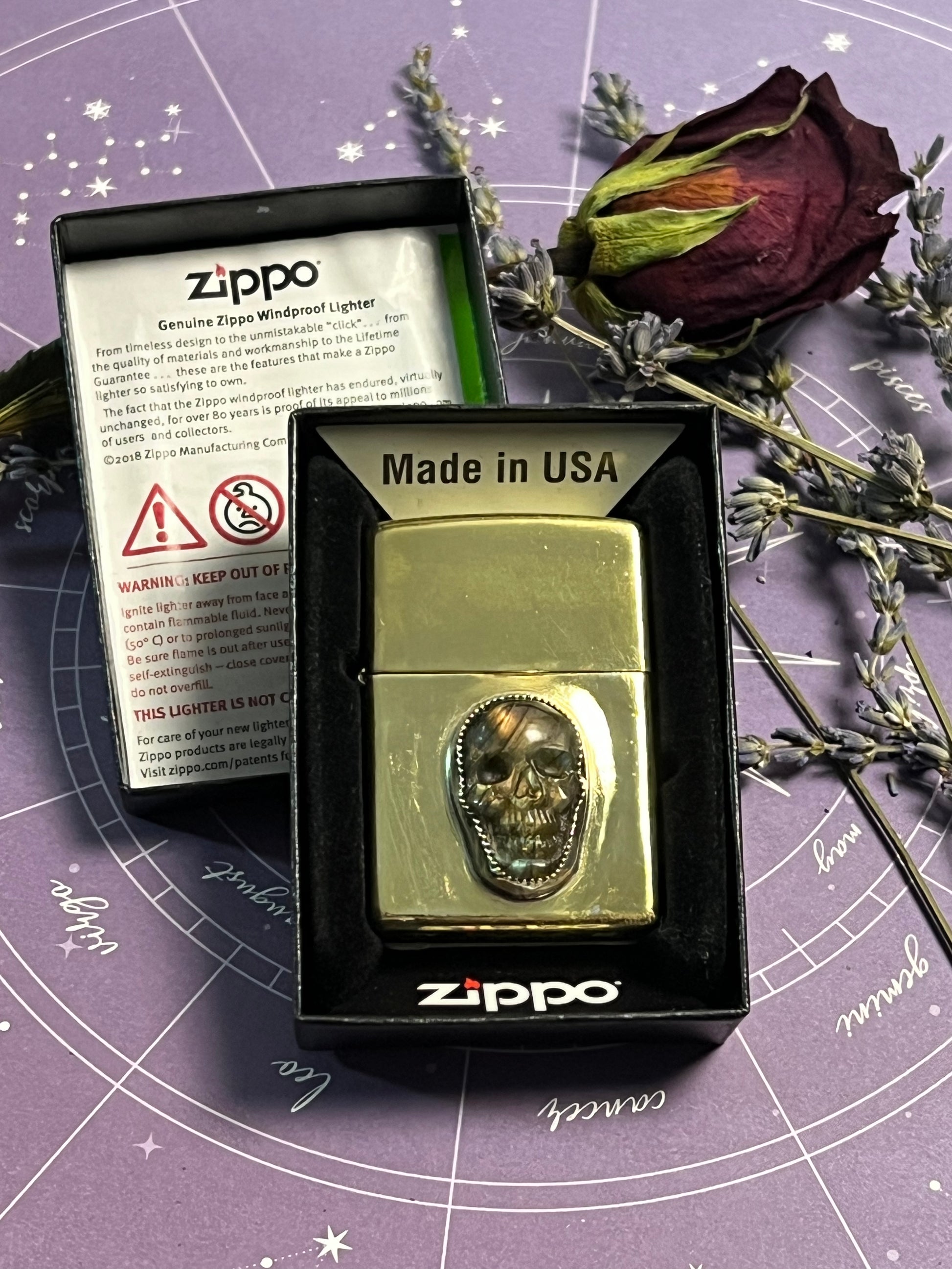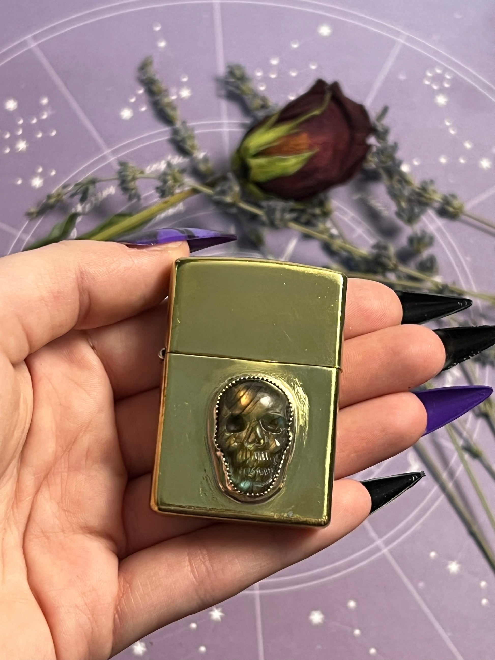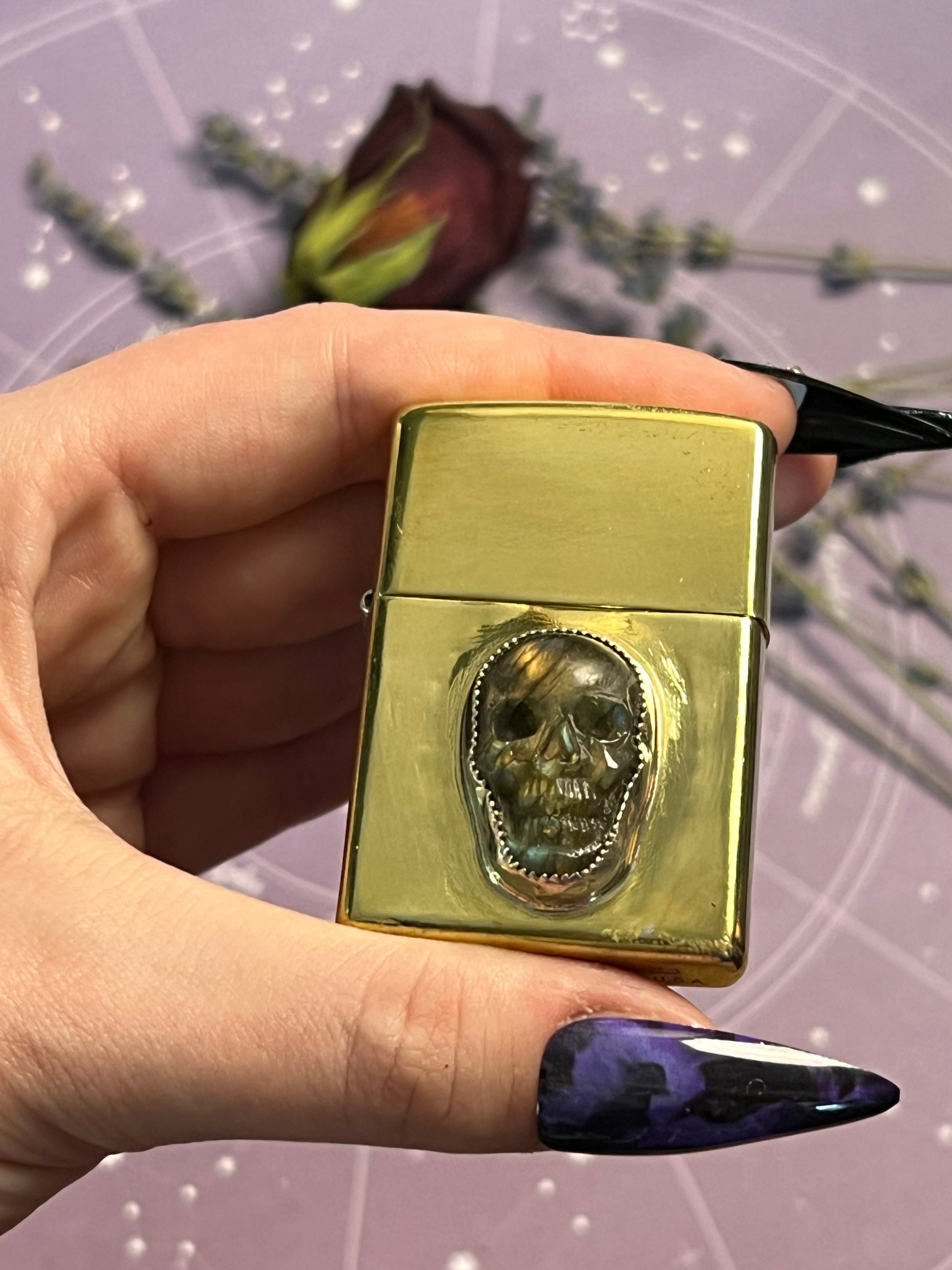 This classic brass zippo lighter features a carved labradorite skull set in silver. Labradorite helps strengthen your intuition, and regain energy while the body and spirit heals itself. It also provides a protective shield to protect against negativity.