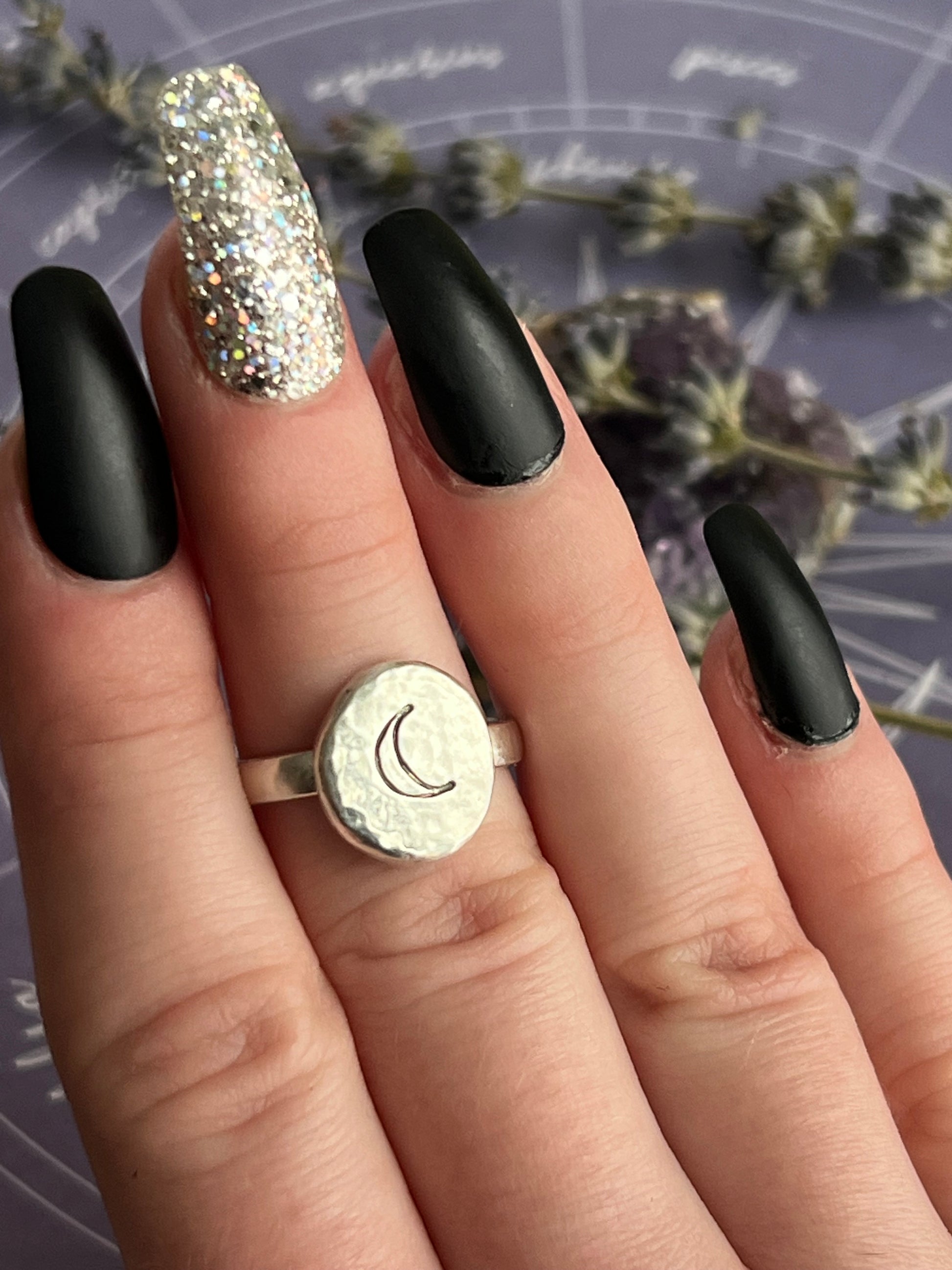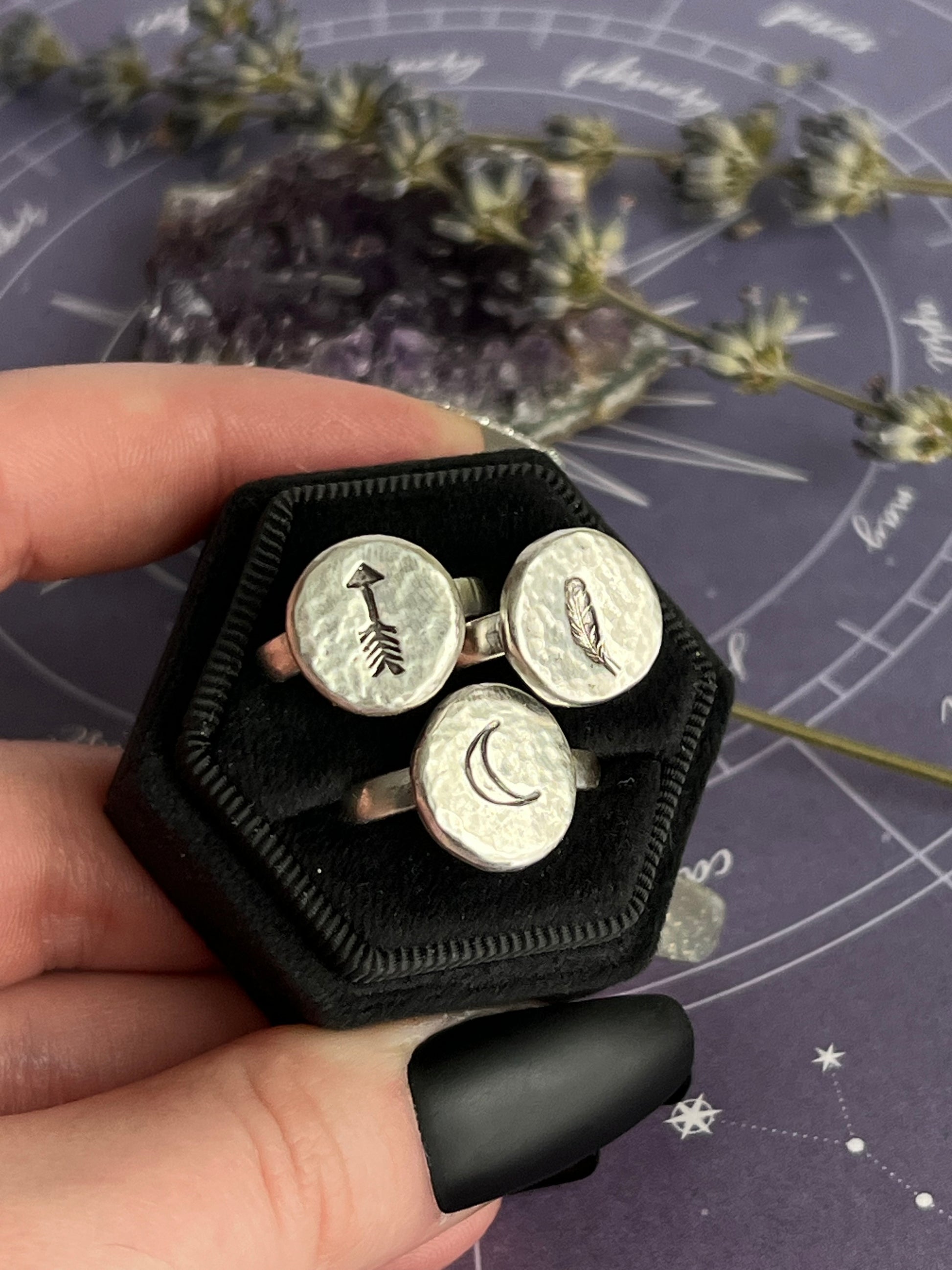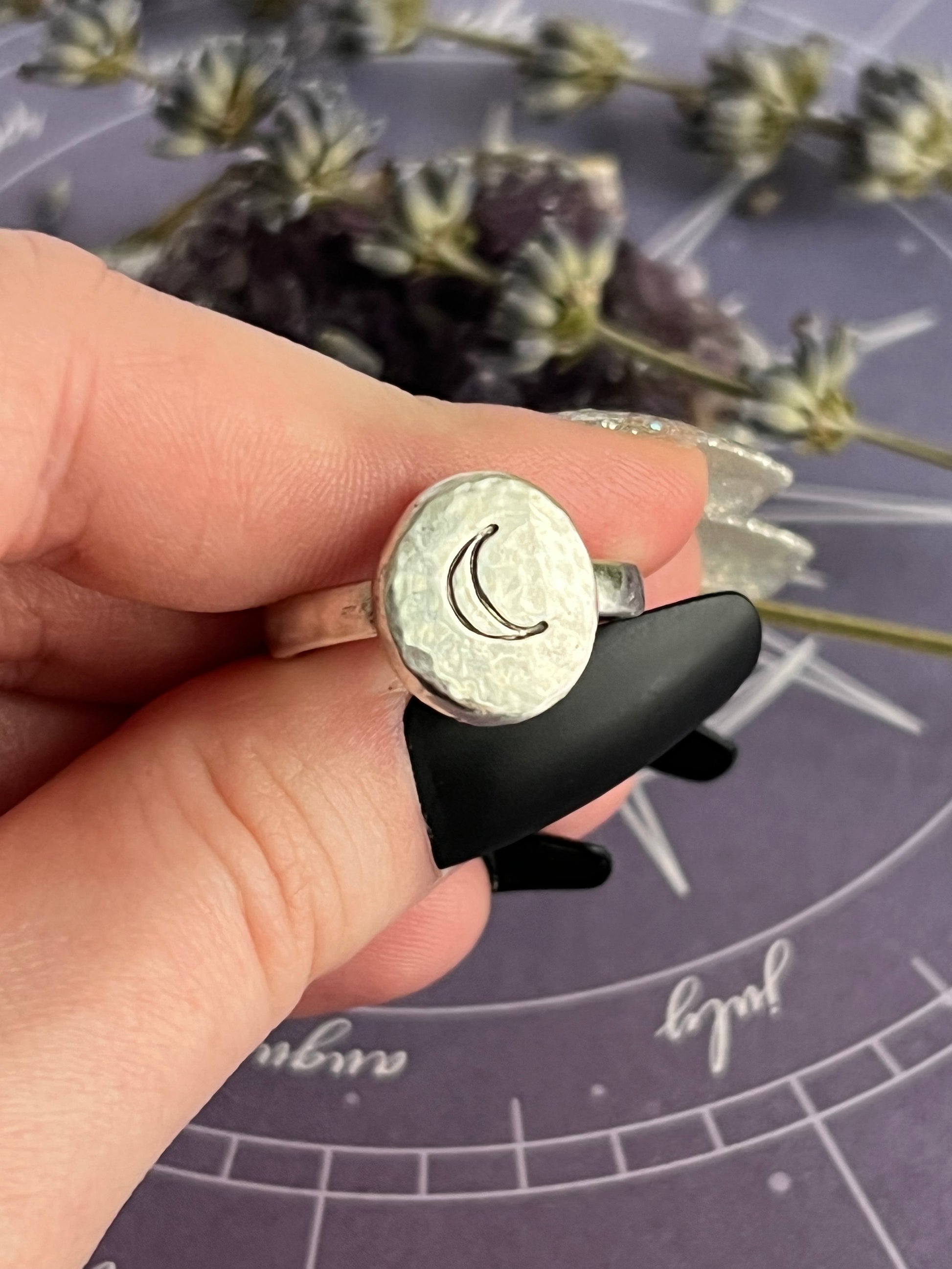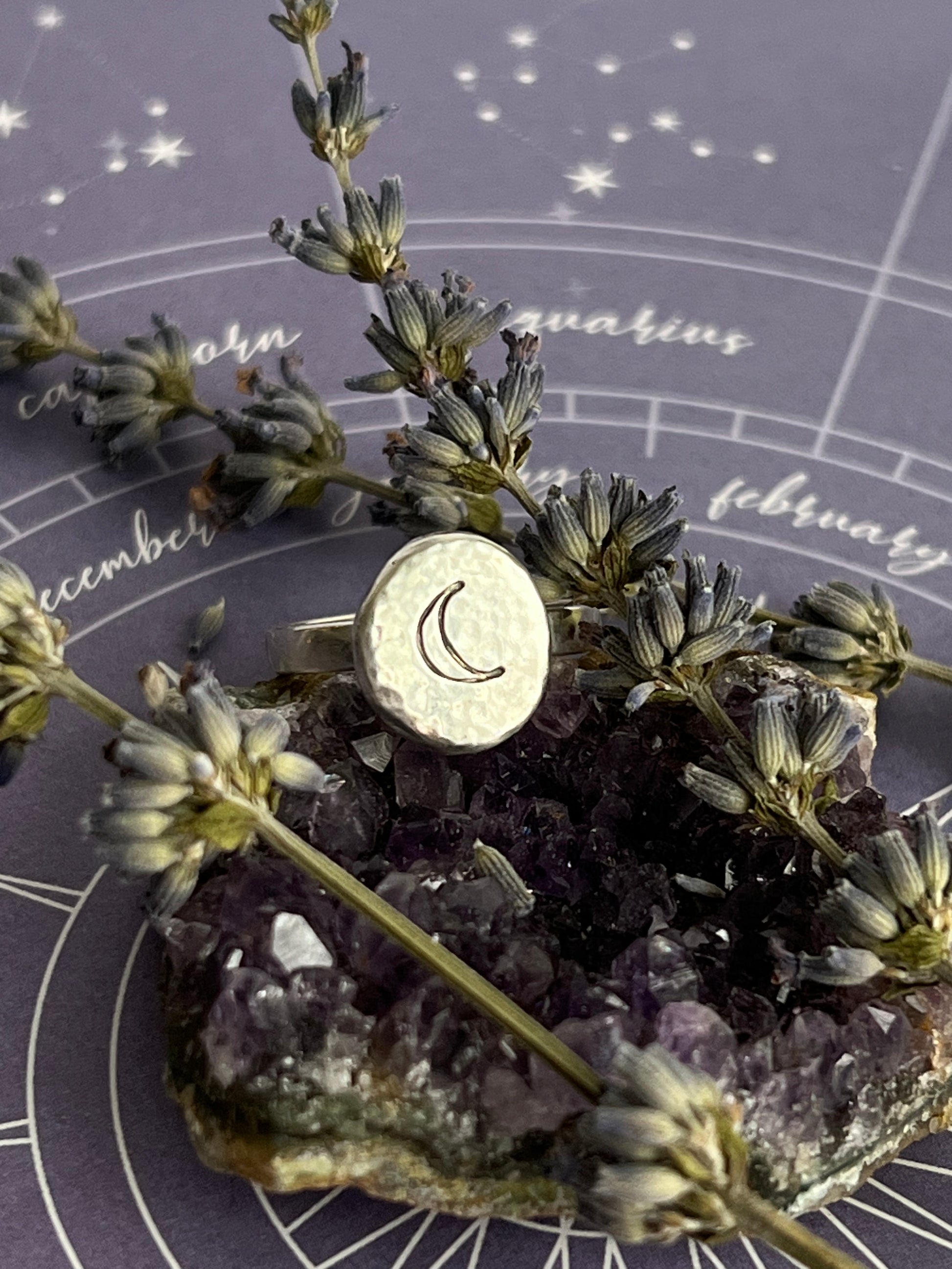 This amulet is made of 100% recycled sterling silver and has an organic, free-formed shape, and hammered finish. Our rings are made to order in your size, so please allow up to 2 weeks for your ring to be made.