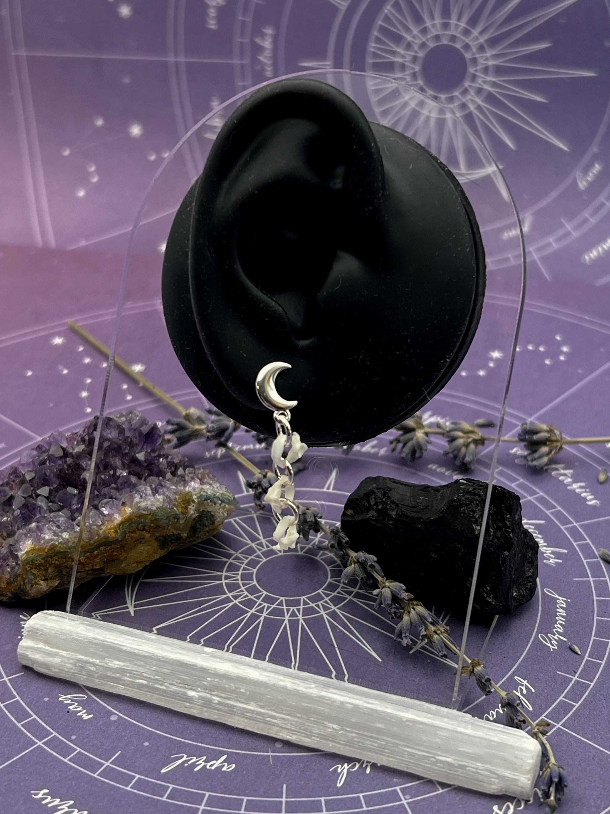 The Morrigan earrings feature a sterling silver crescent moon earring with crow vertebrae. The earrings measure 1 1/2 inches long.