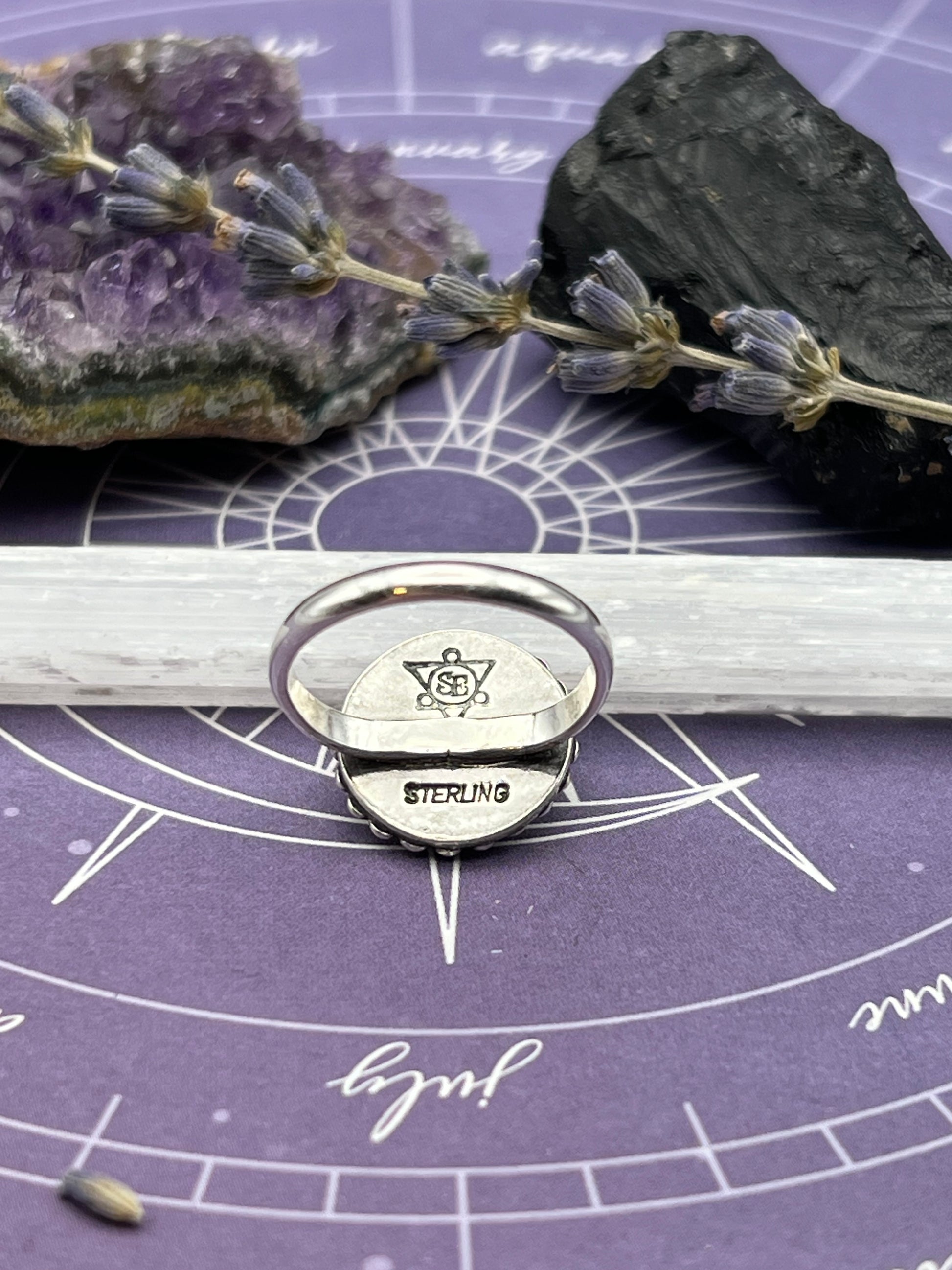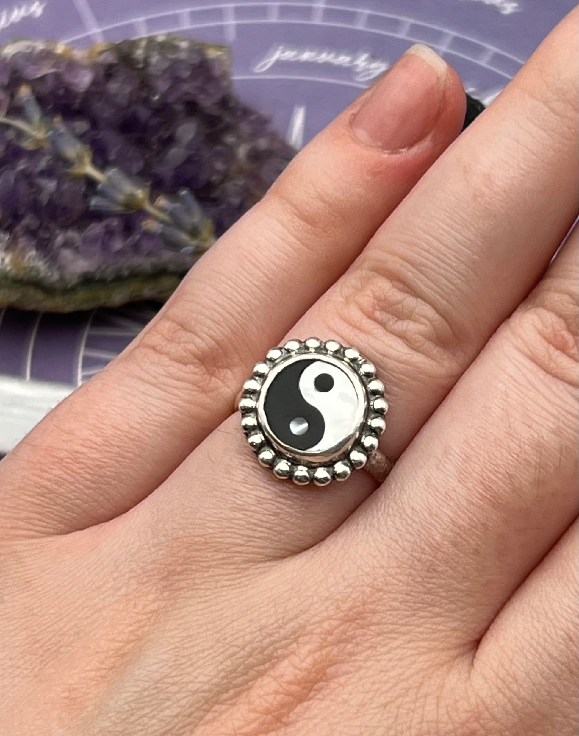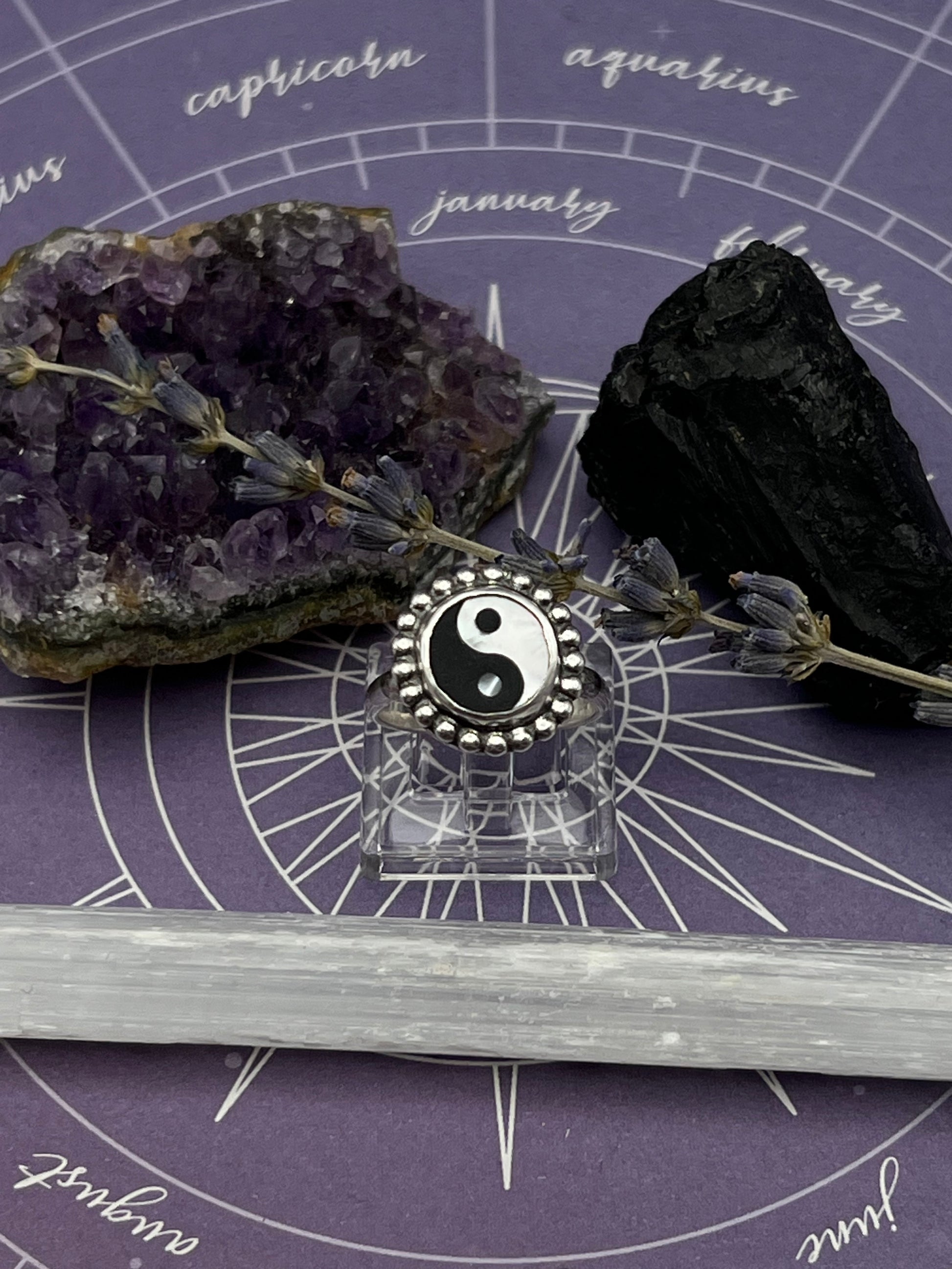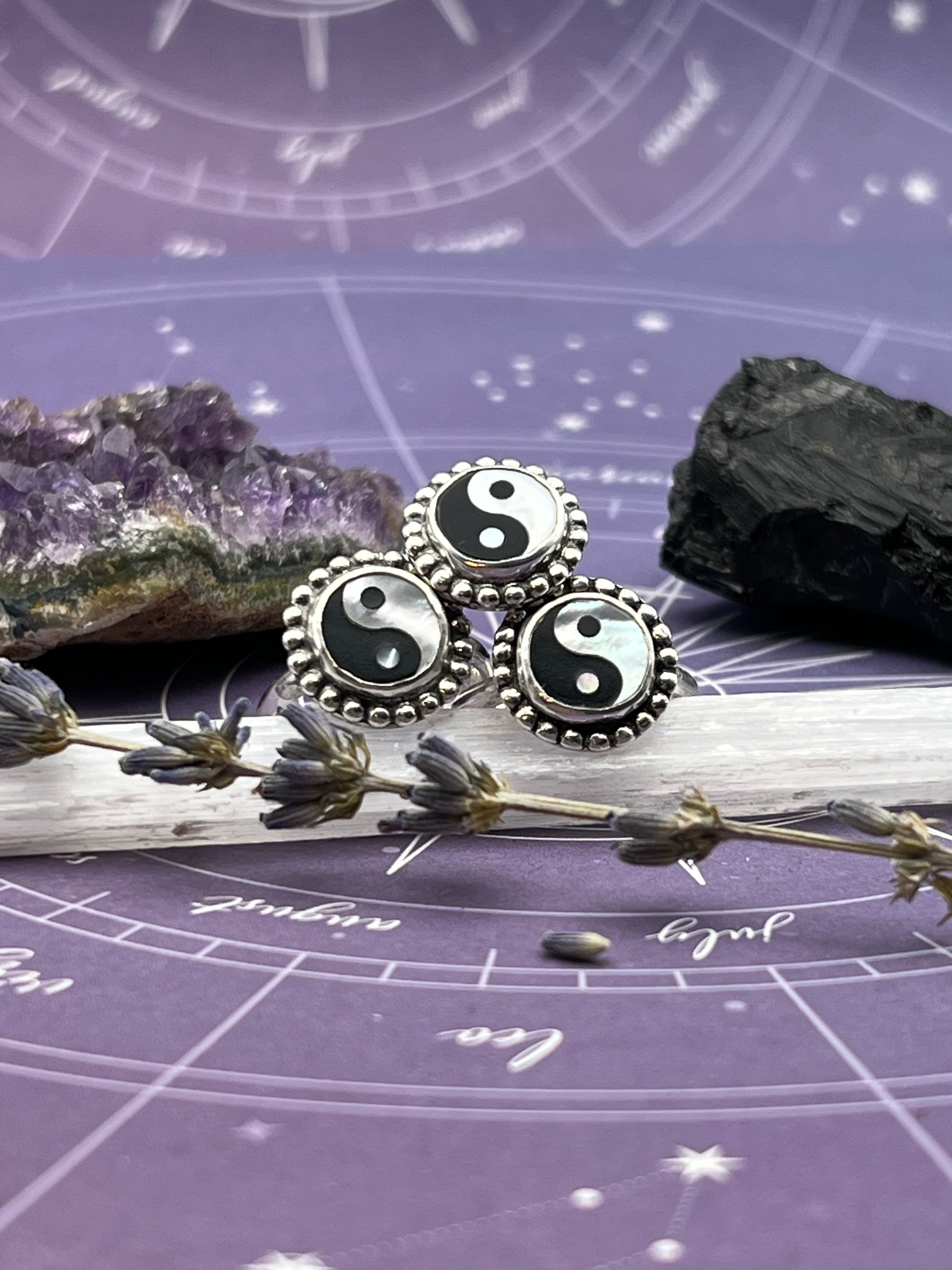 The duality ring features a yin-yang made of mother of pearl and ethically sourced horn set in sterling silver.