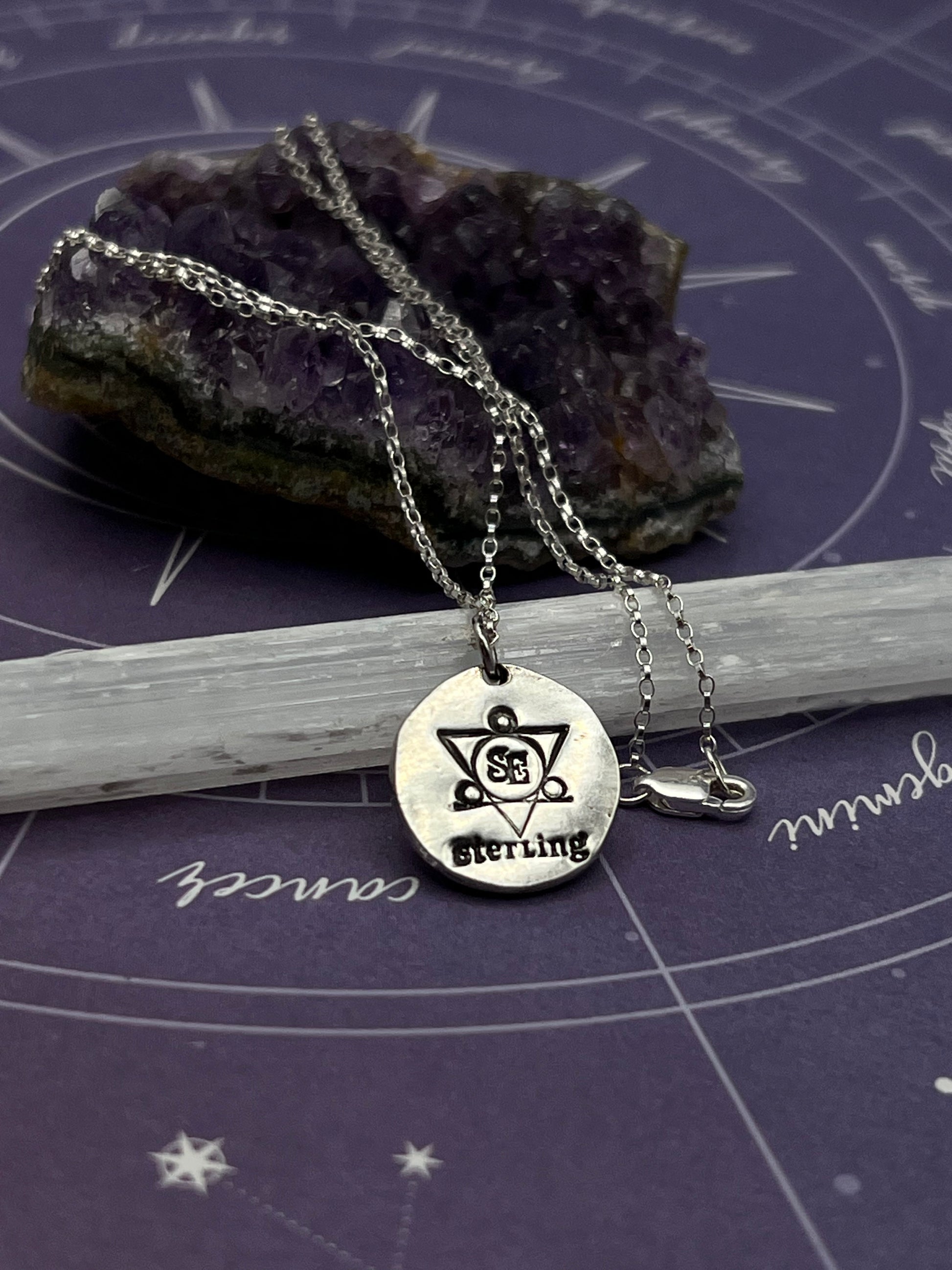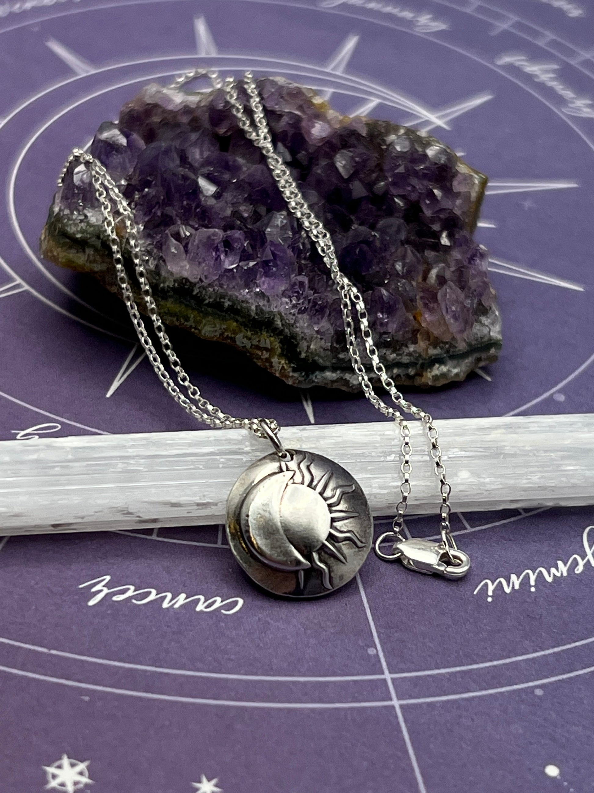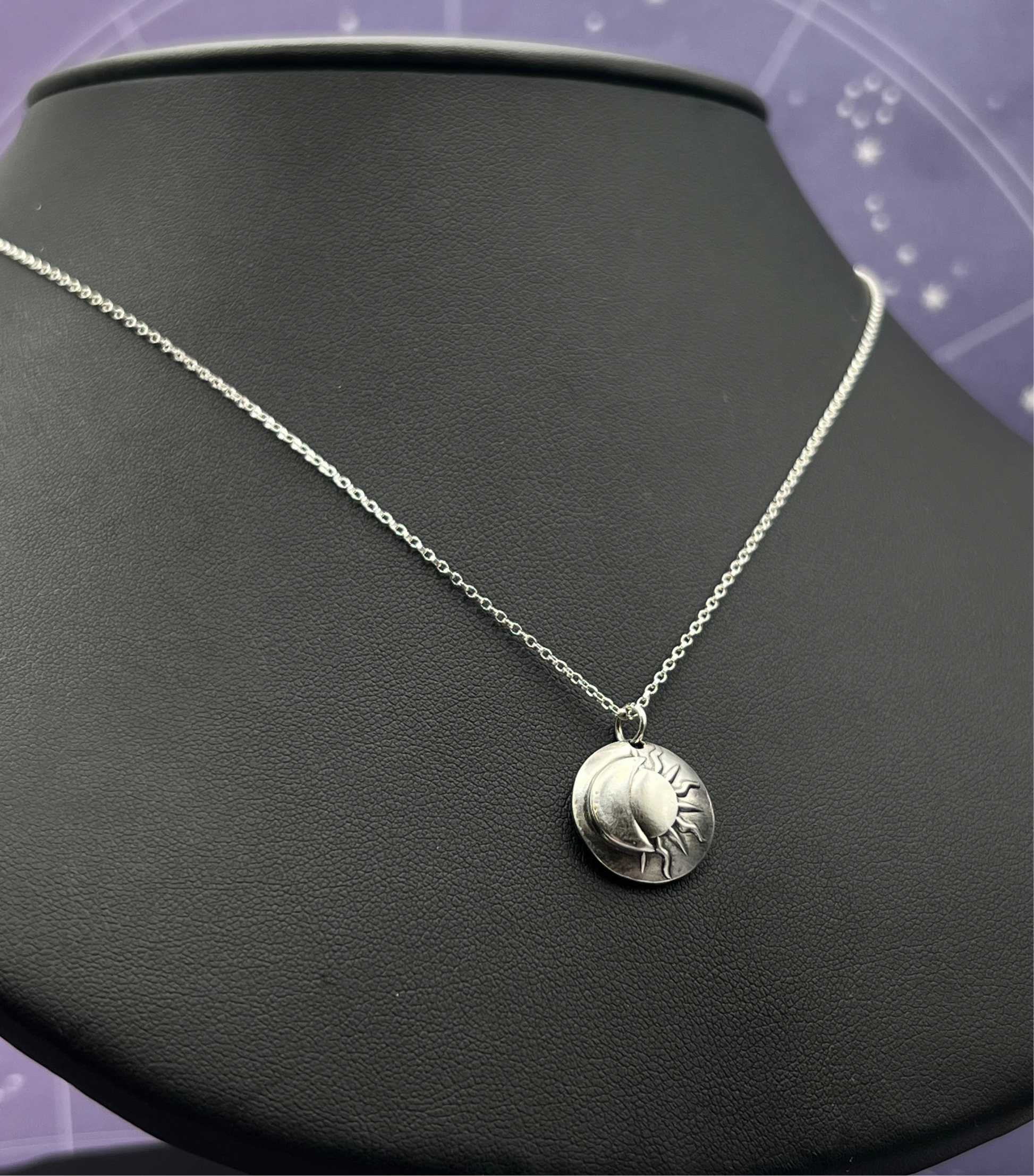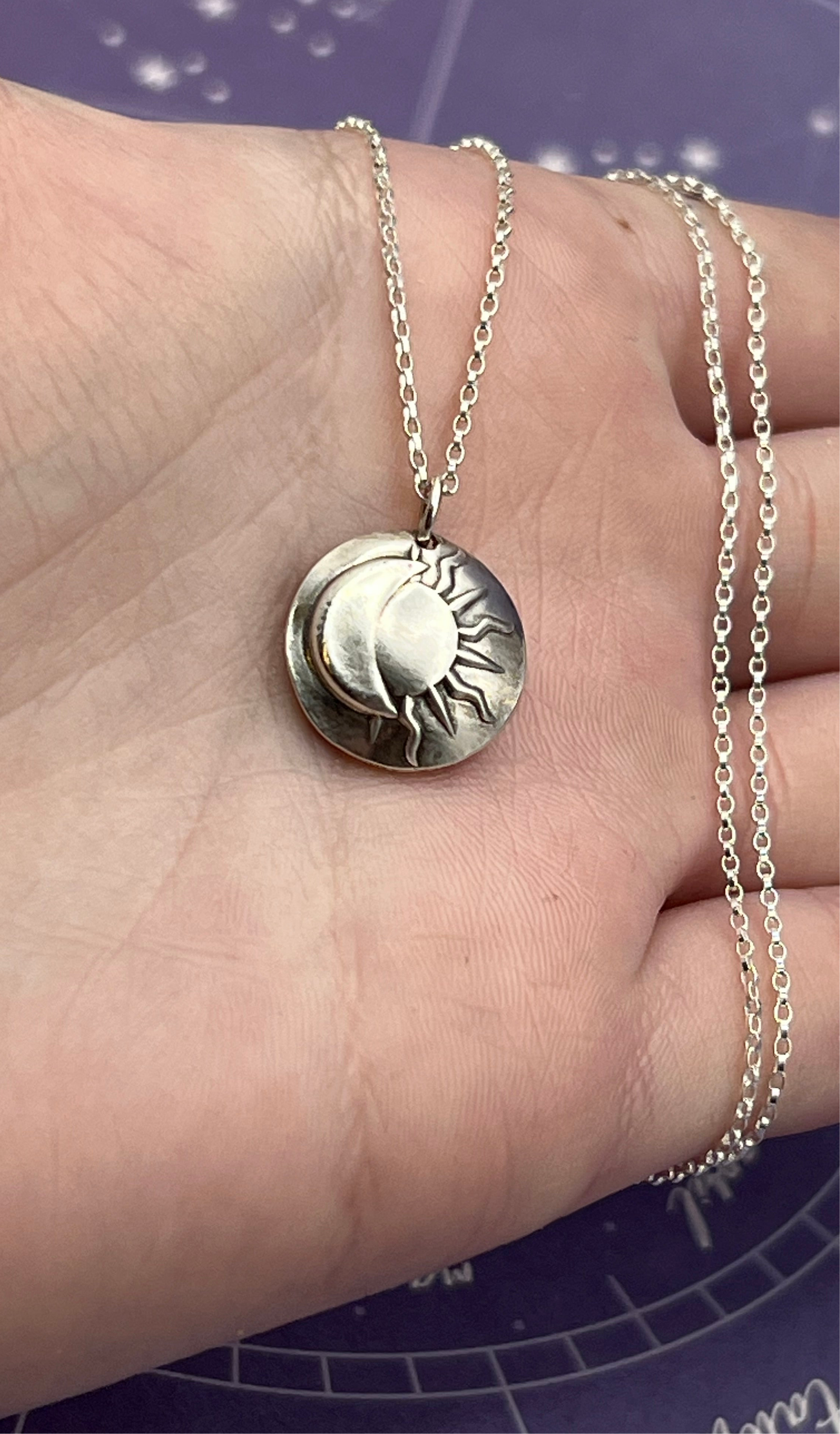 This pendant depicts the sun and moon. It is sterling silver and hangs on a 20 inch sterling silver chain.