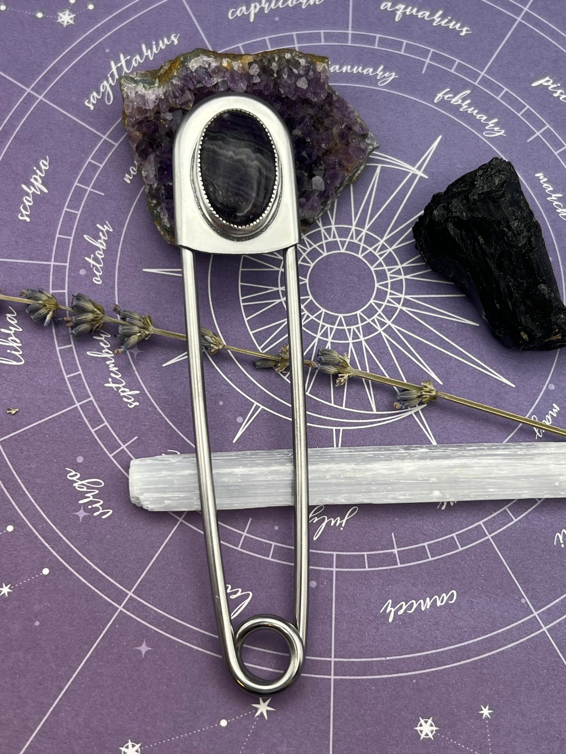 This jumbo safety pin is stainless steel and can be used as a keychain, hat accessory, or clothing accessory. It features a piece of fluorite set in silver. Fluorite promotes mental clarity, clears negative energy, and improves confidence.