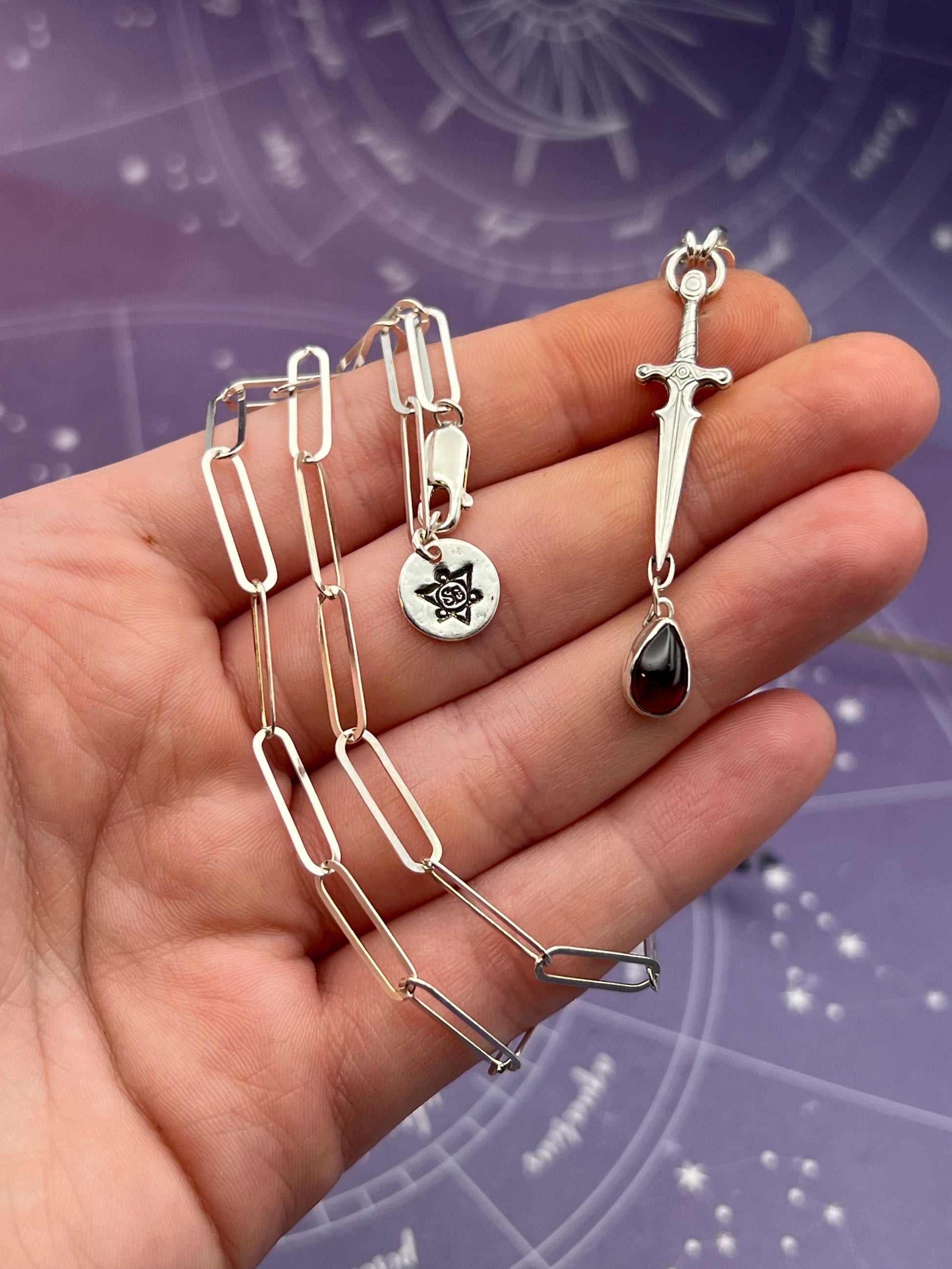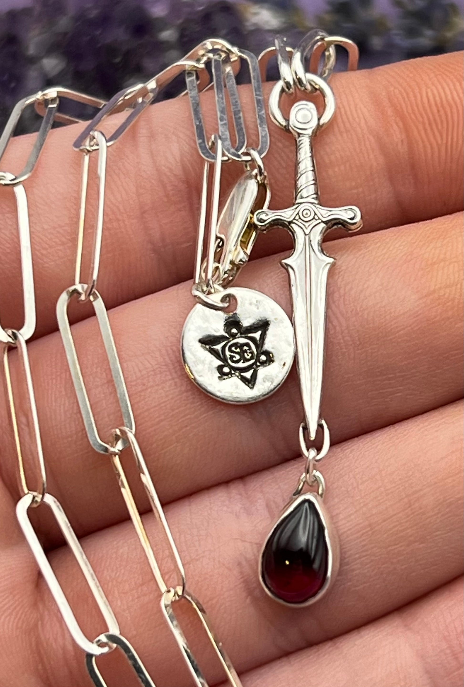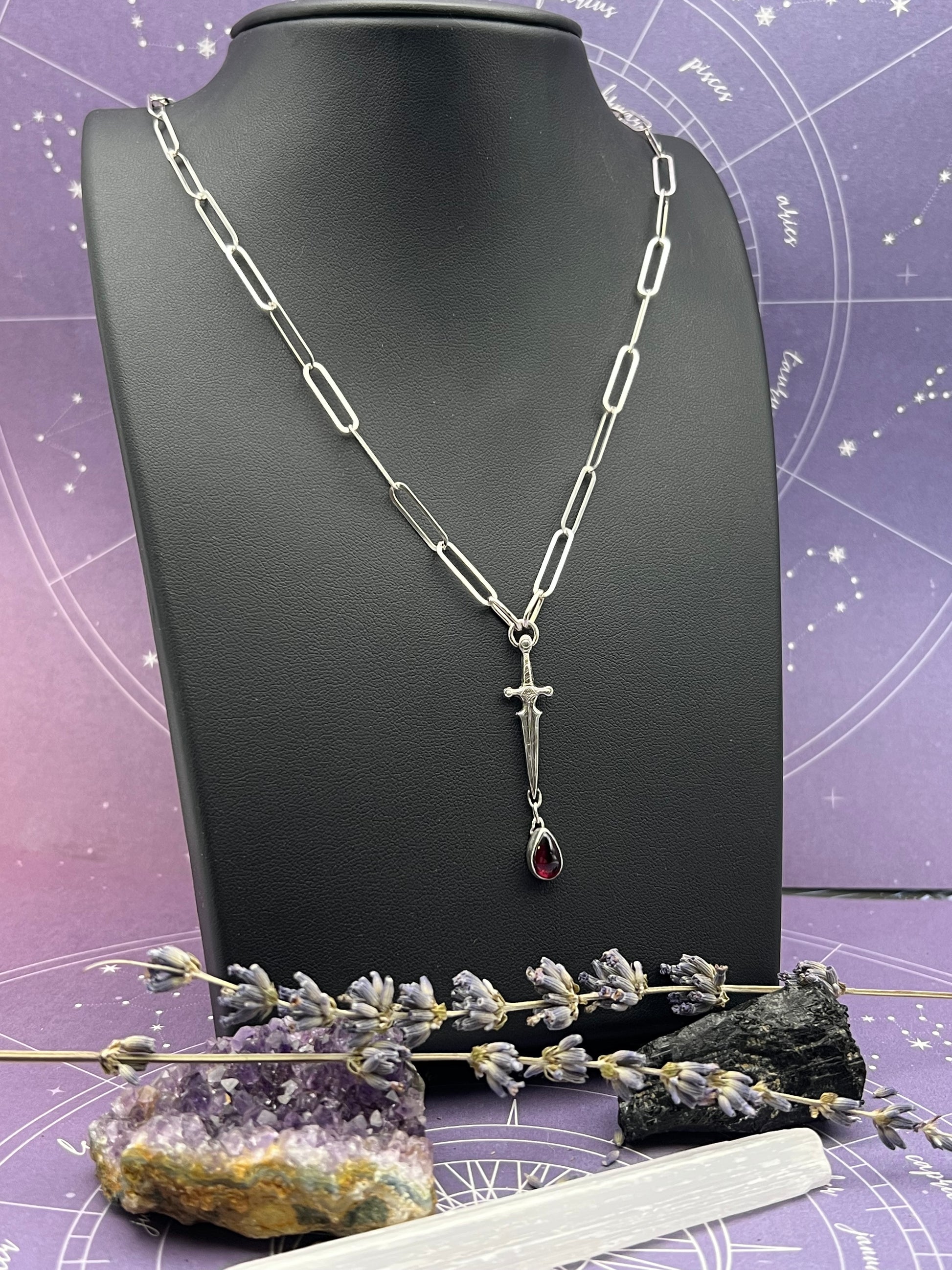The necklace features a handmade dagger of sterling silver with a garnet hanging from it. The paper clip chain is sterling silver and 18 inches long. The entire necklace is made of sterling silver and measures 22 inches in total length to the end of the garnet.