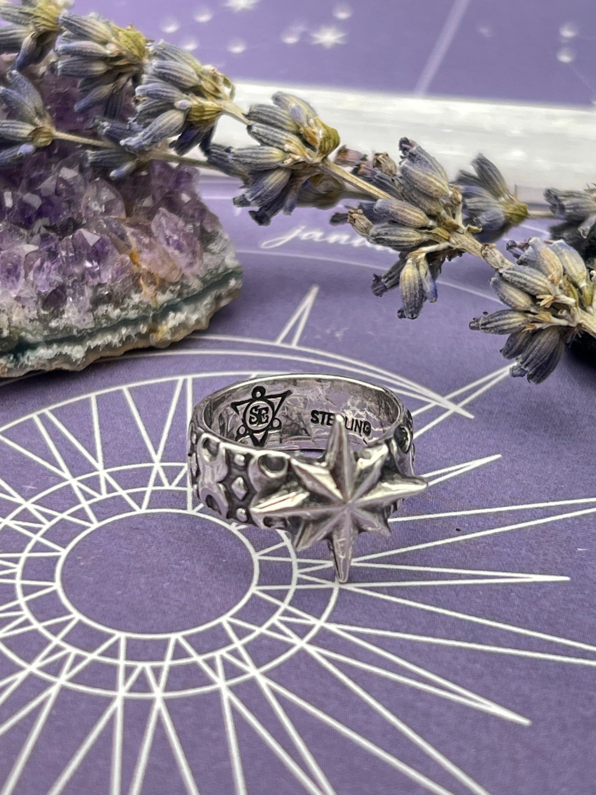 The guiding star ring is completely hand crafted from sterling silver. It features an eight point compass style star on a crescent moon wide band.