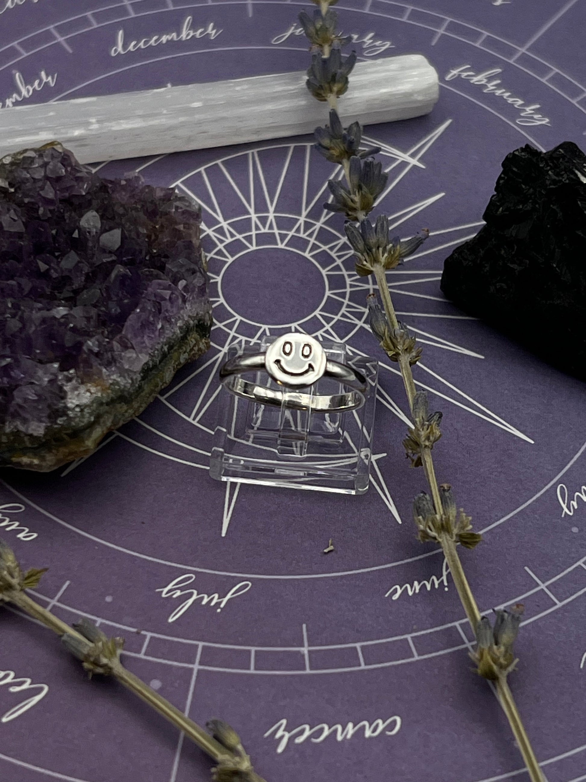 This sterling silver ring features a smiley face and is a great stacking ring.