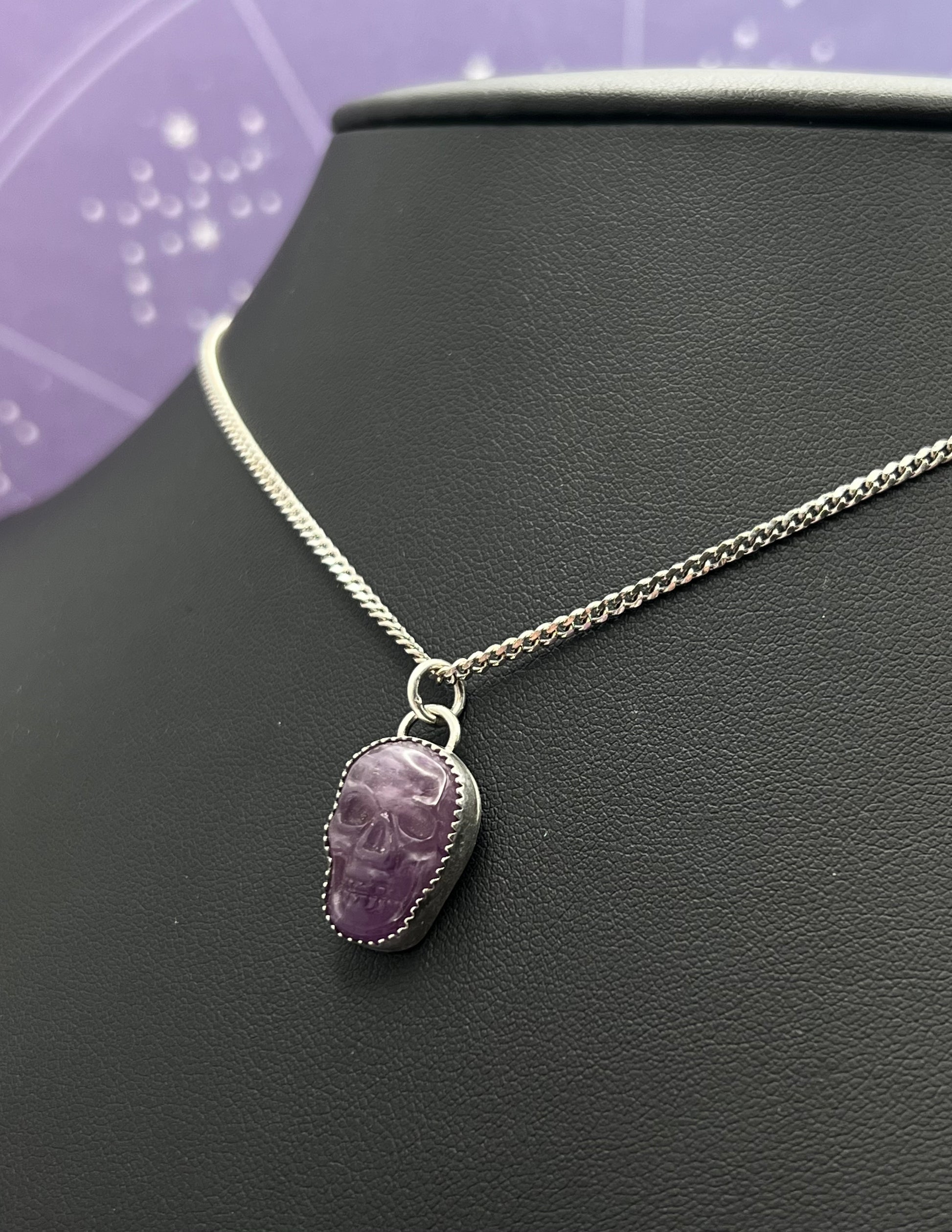 This necklace features a carved amethyst skull pendant set in sterling silver. It hangs on an 18 inch sterling silver Miami cuban link chain that has been antiqued.