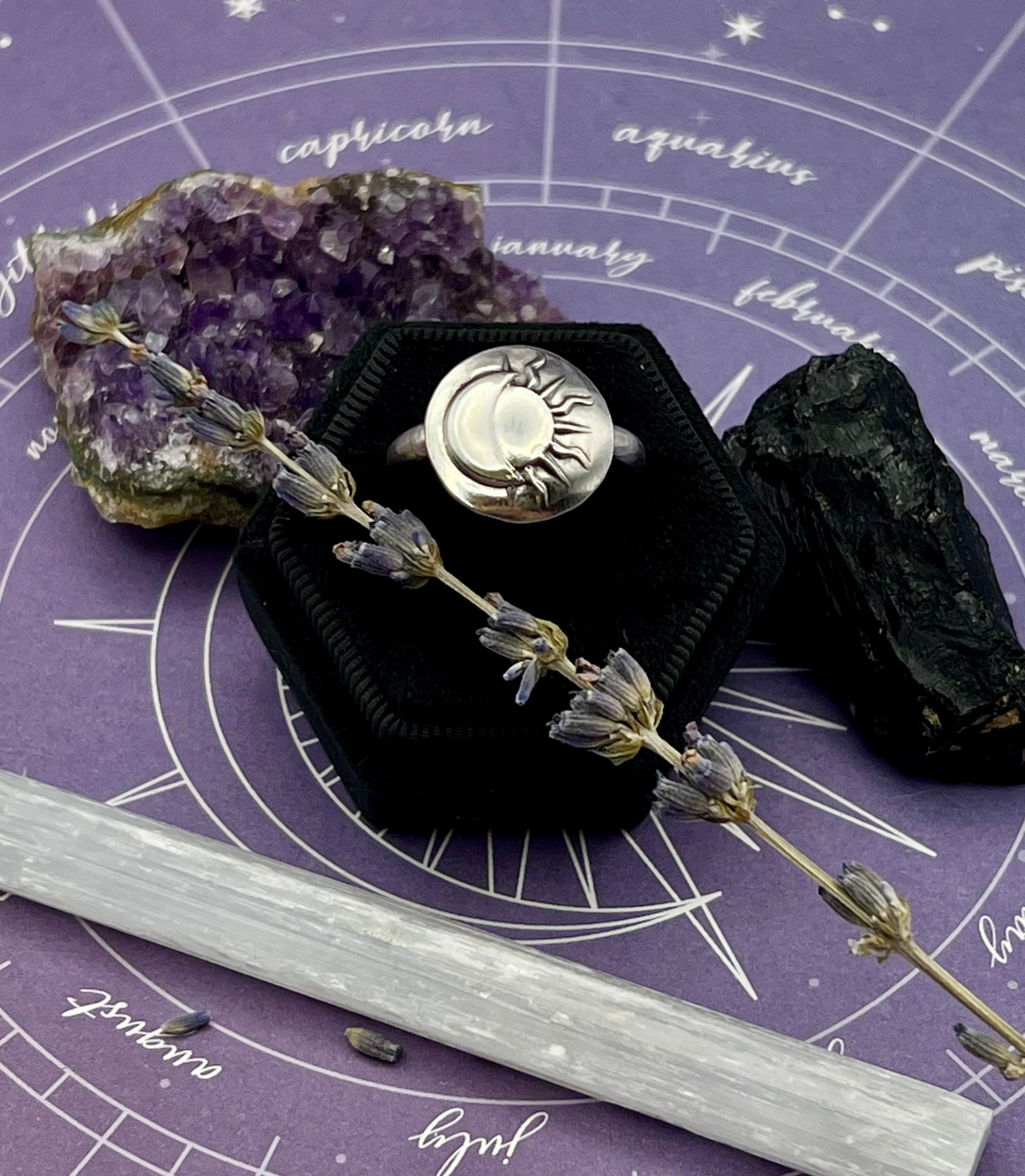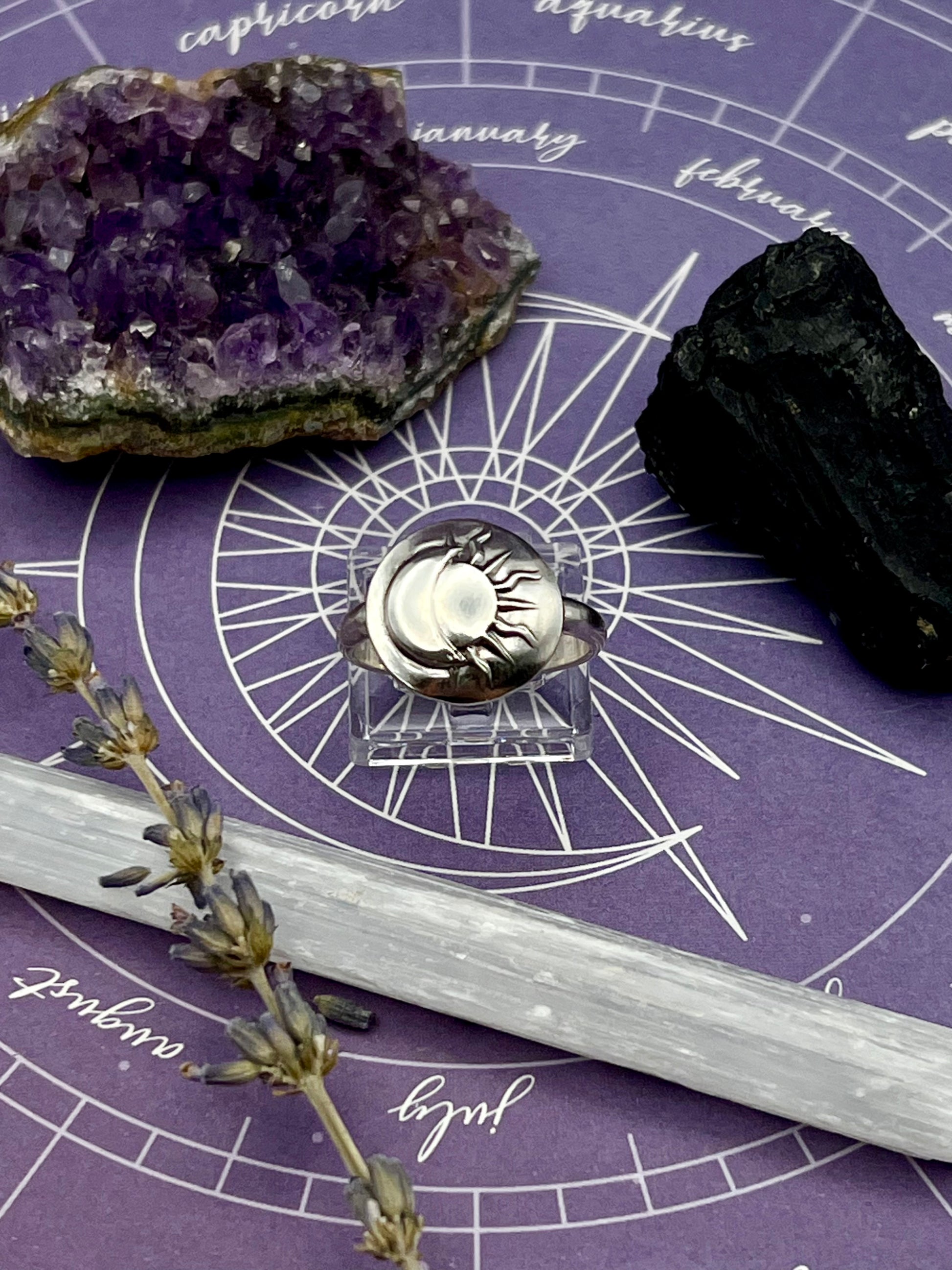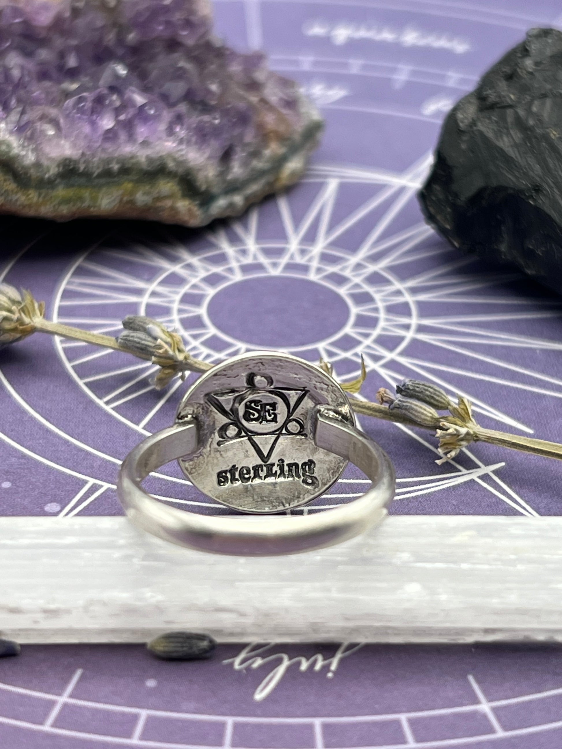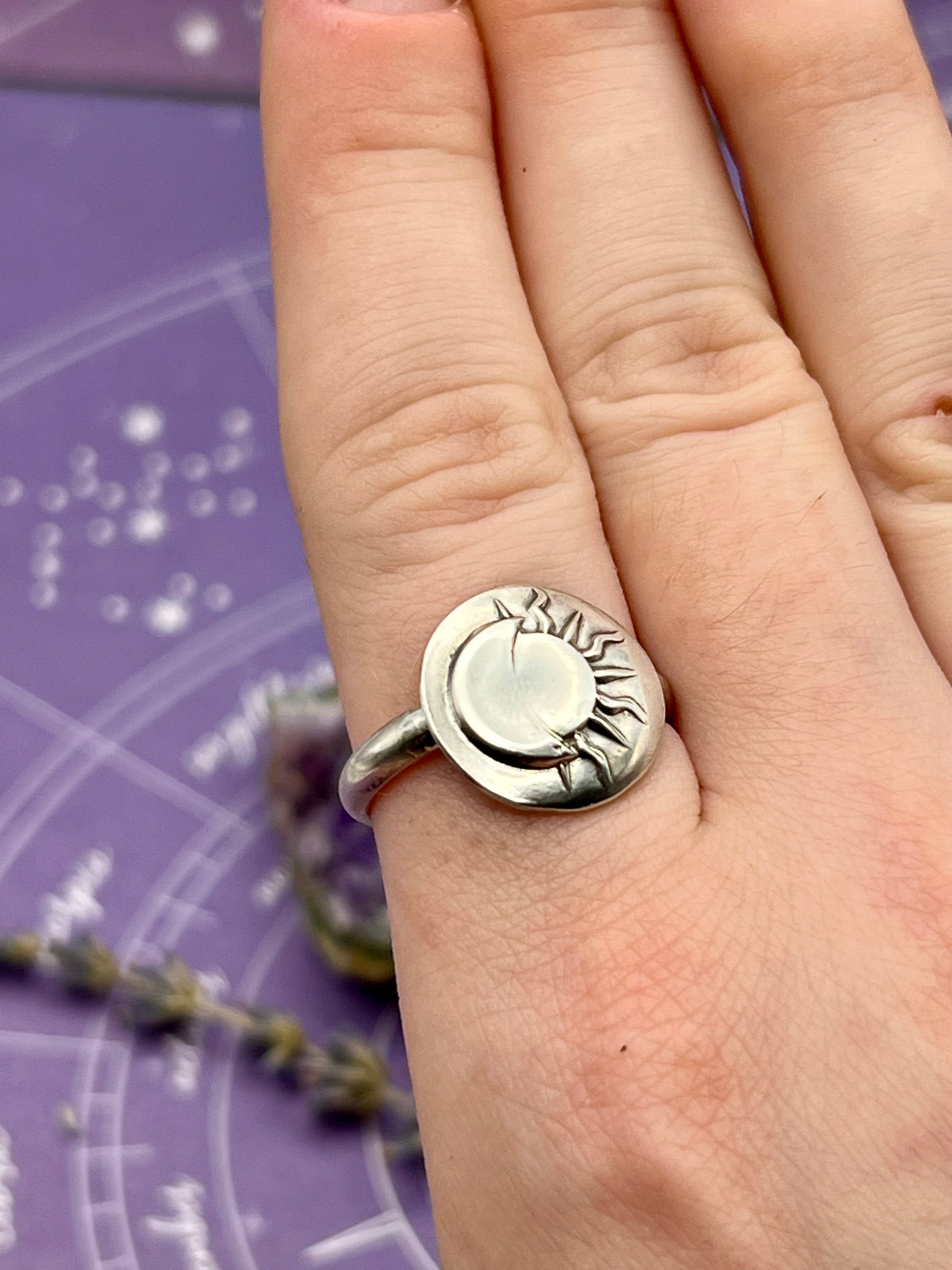 This ring is made entirely of sterling silver. The eclipse is hand pressed from a die, stamped with our logo and "sterling", and polished to perfection.