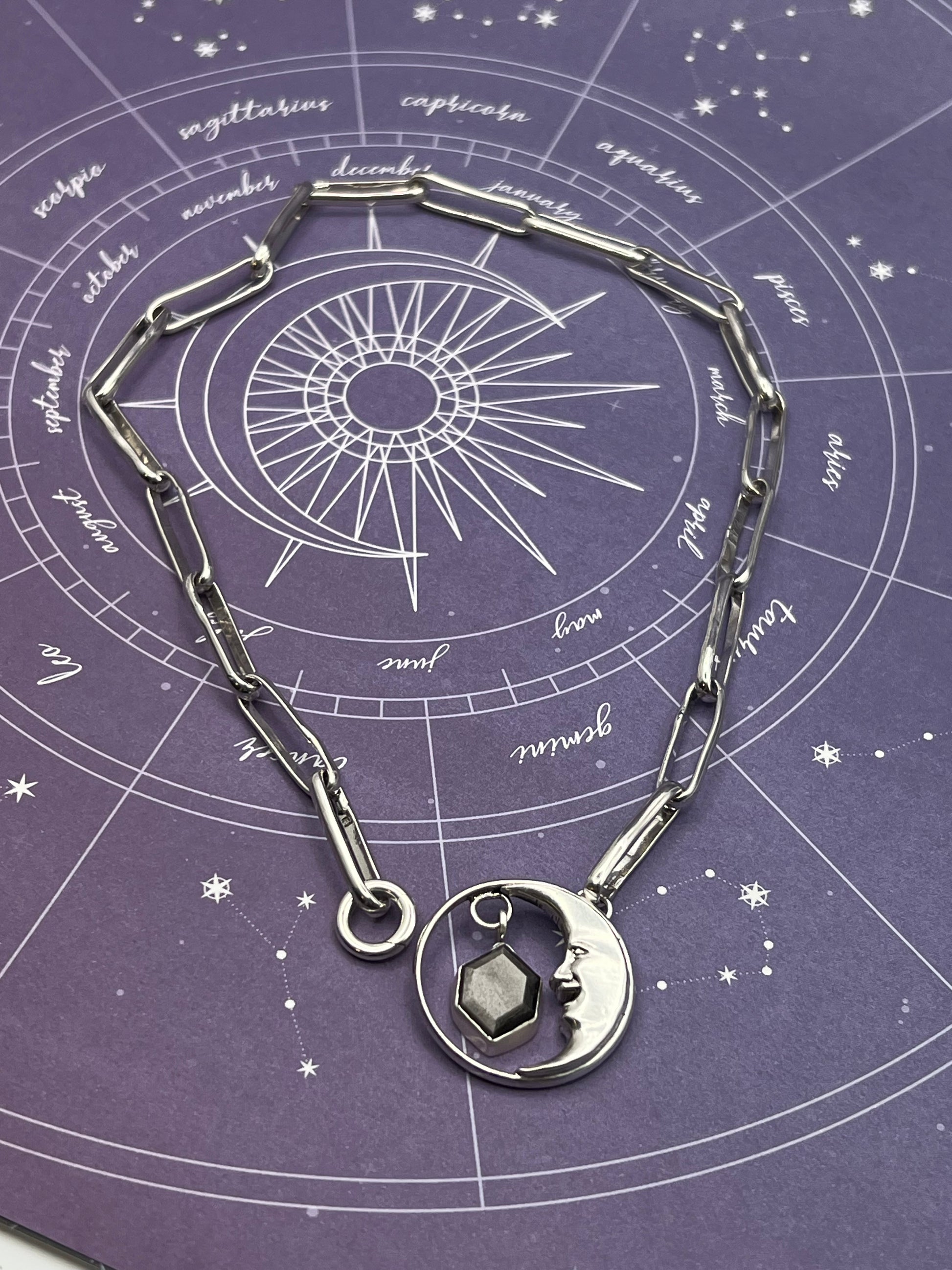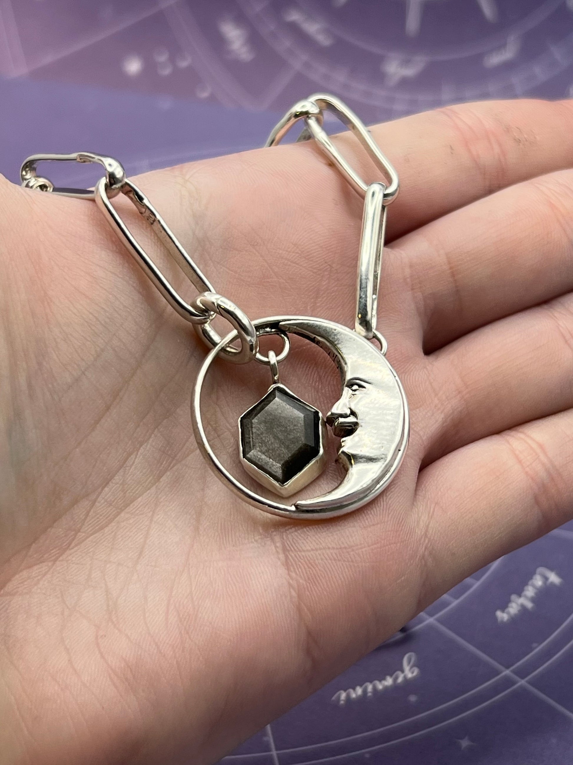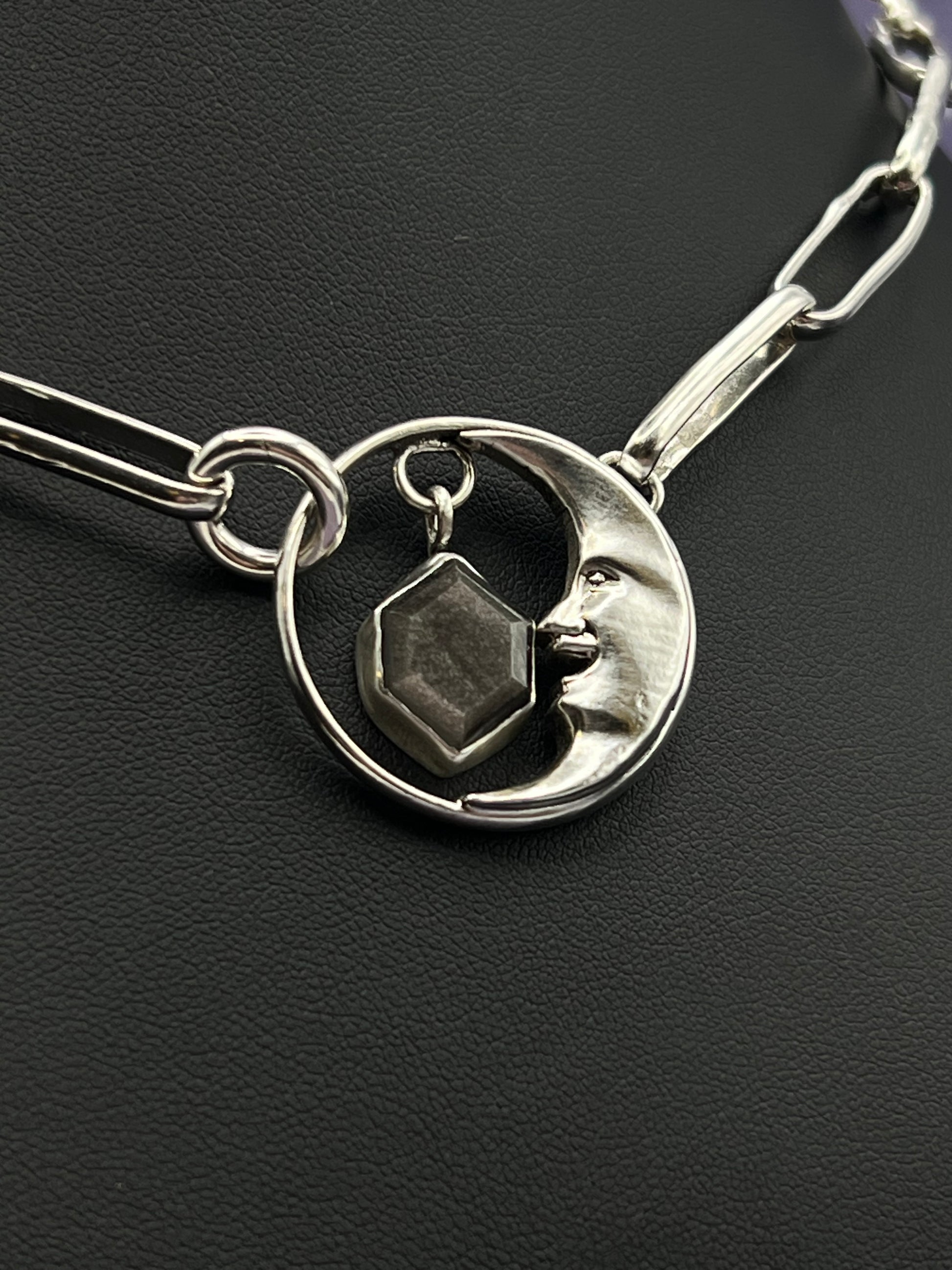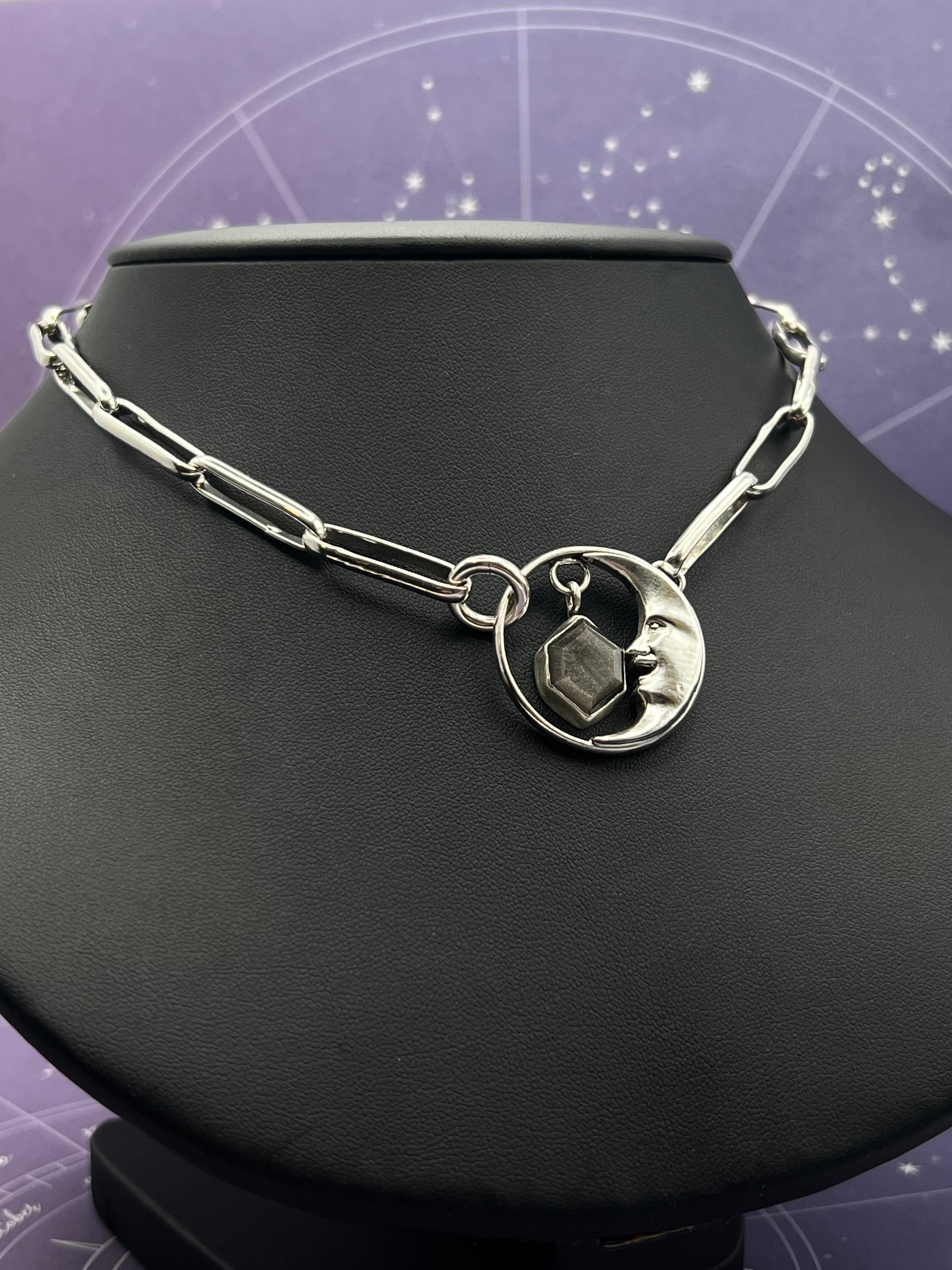 This piece is an absolute labor of love. Completely handcrafted sterling silver, including the chunky paper clip chain. It is a choker style measuring 17 inches long. The handcrafted man in the moon pendant features a silver sheen obsidian. Silver sheen obsidian is great for protection due to its ability to absorb, transmute, and deflect negative energy.