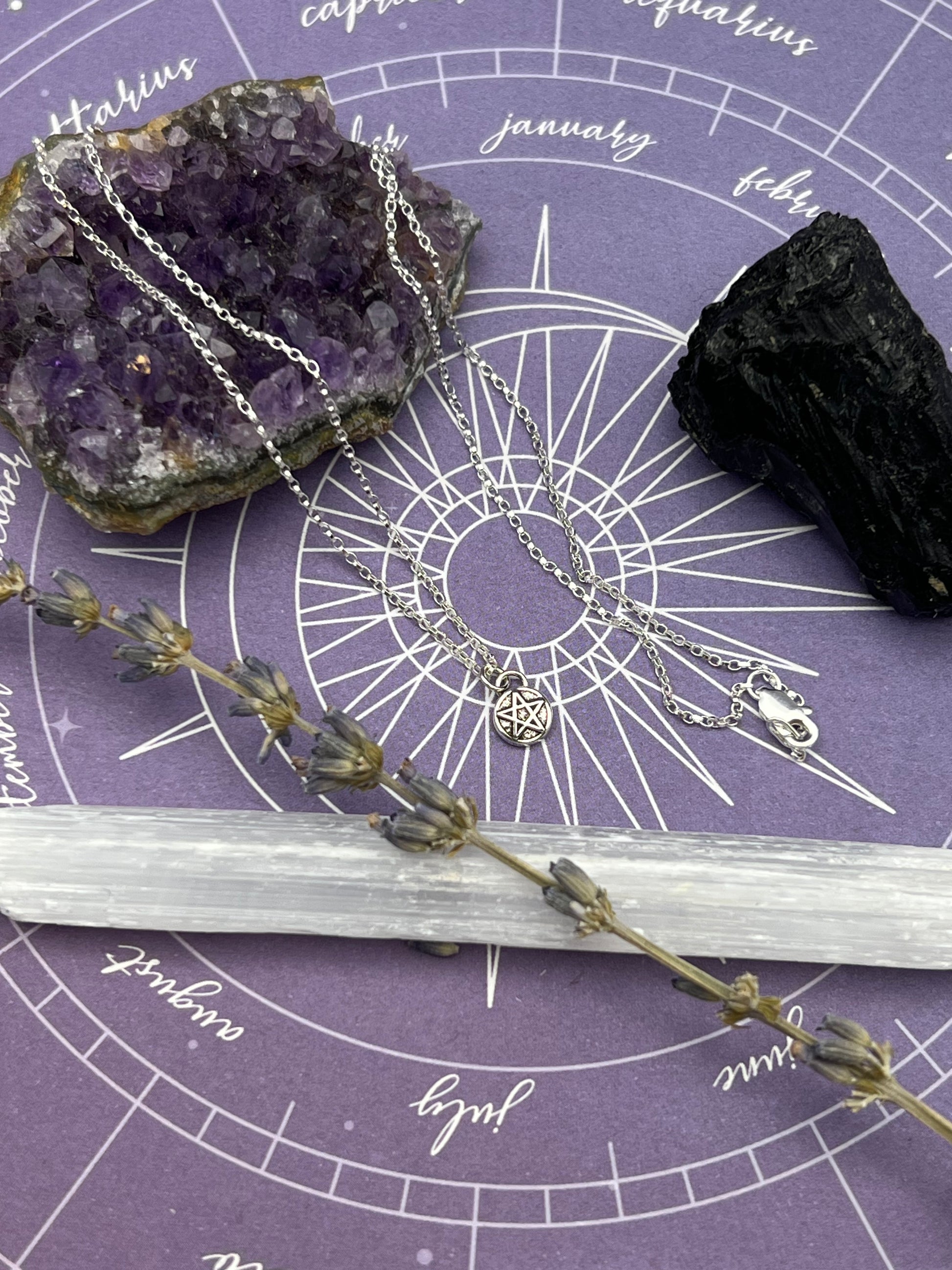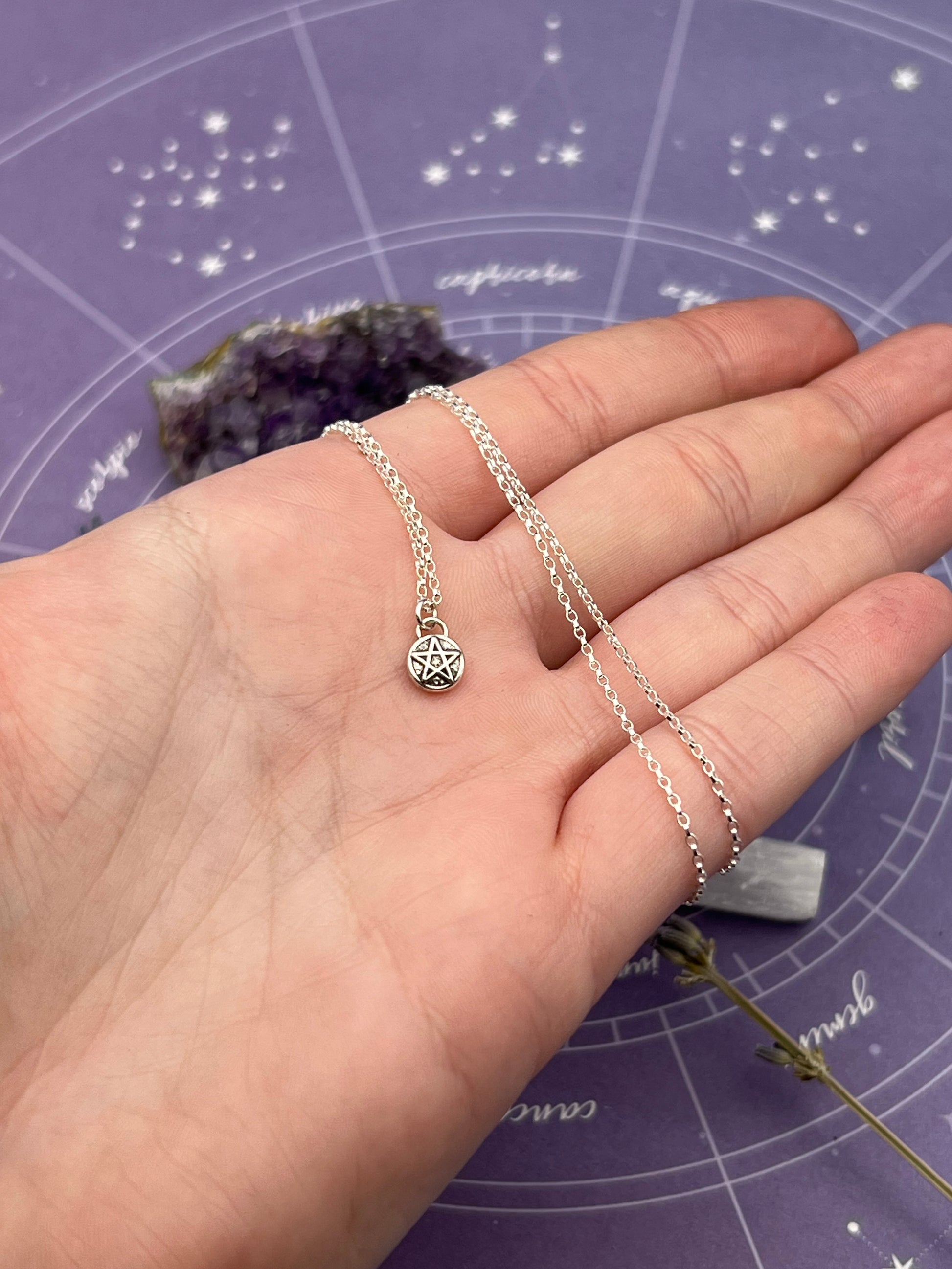 This necklace features the pentacle talisman in sterling silver hanging on an 18 inch sterling silver chain. The amulet pendant is about 1/4 inch.