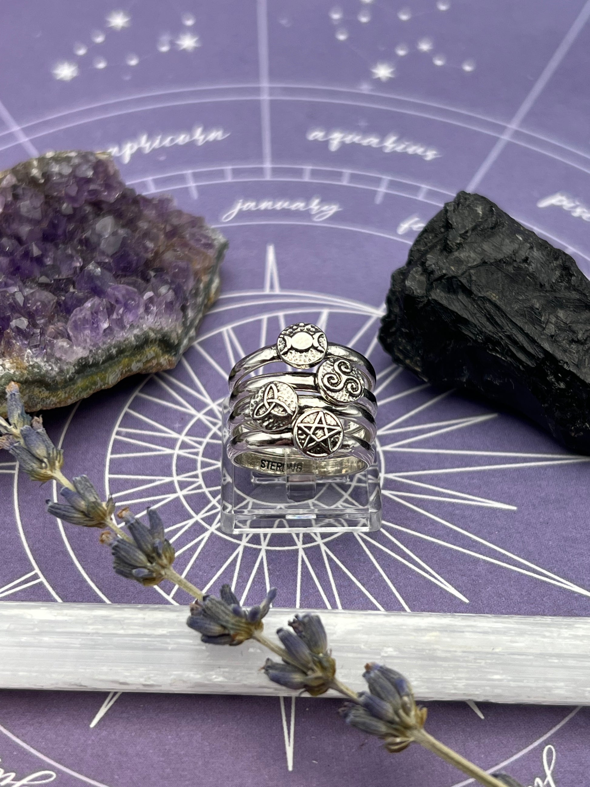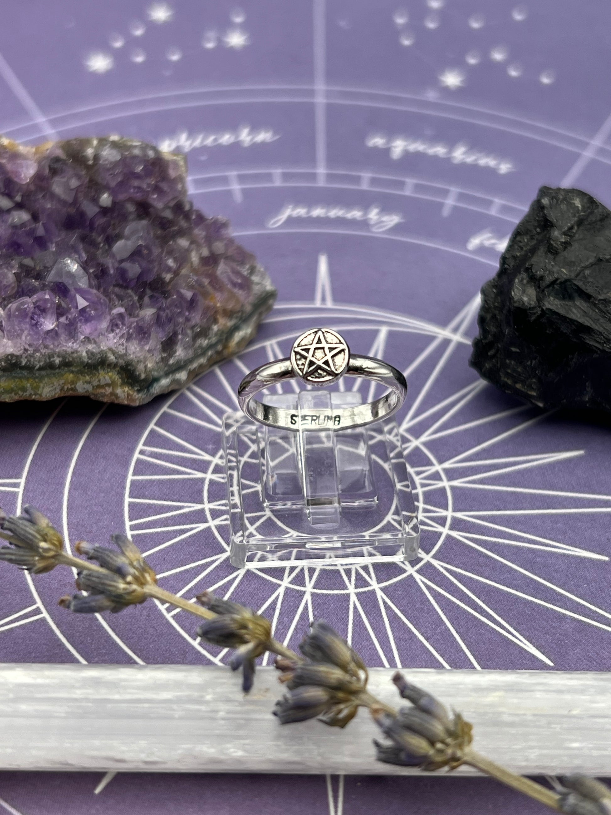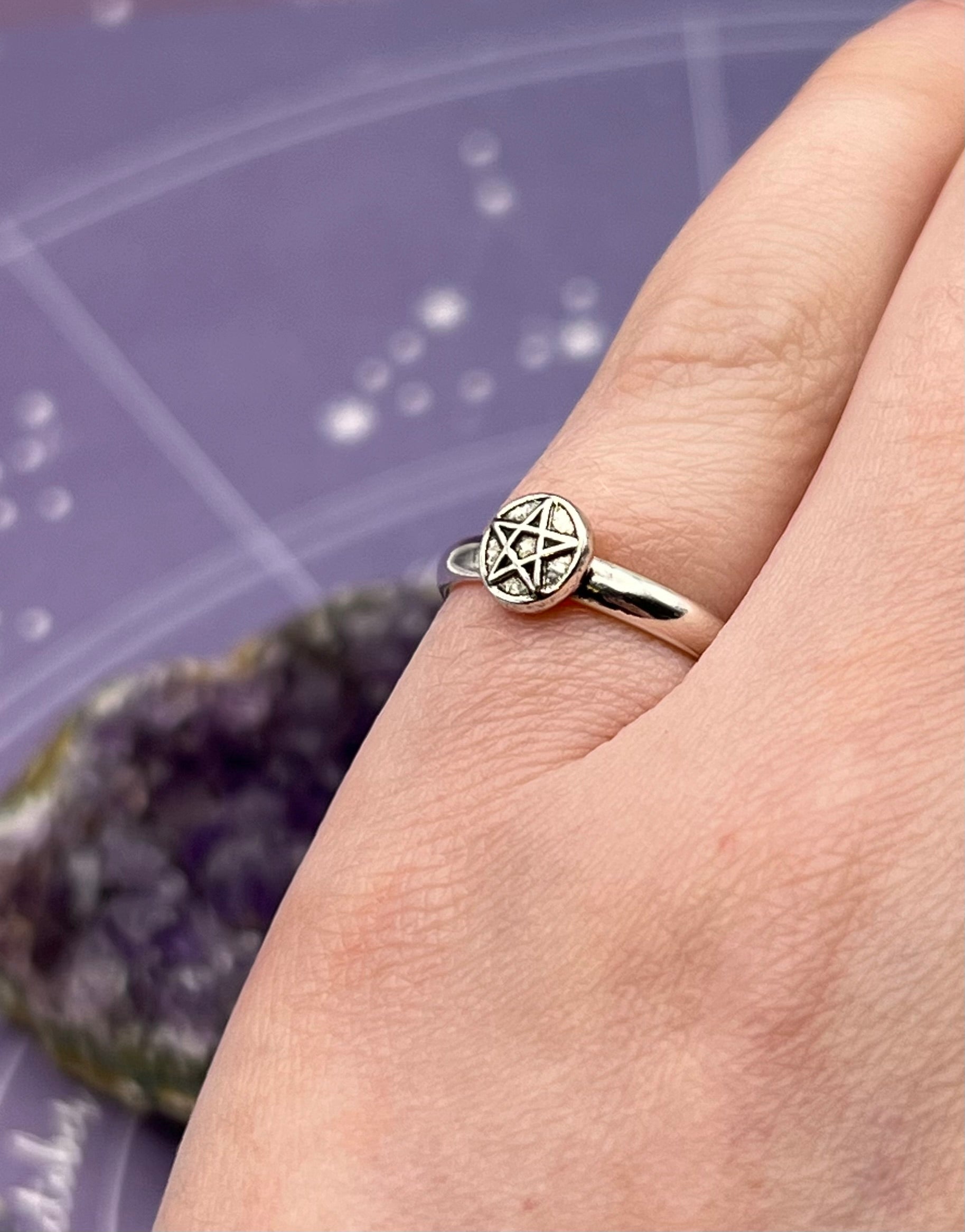 This sterling silver ring features the pentacle talisman. The pentacle represents the five elements: fire, air, water, earth, and spirit. The symbol has been adapted by many different cultures through time. It has always been associated with divine protection.