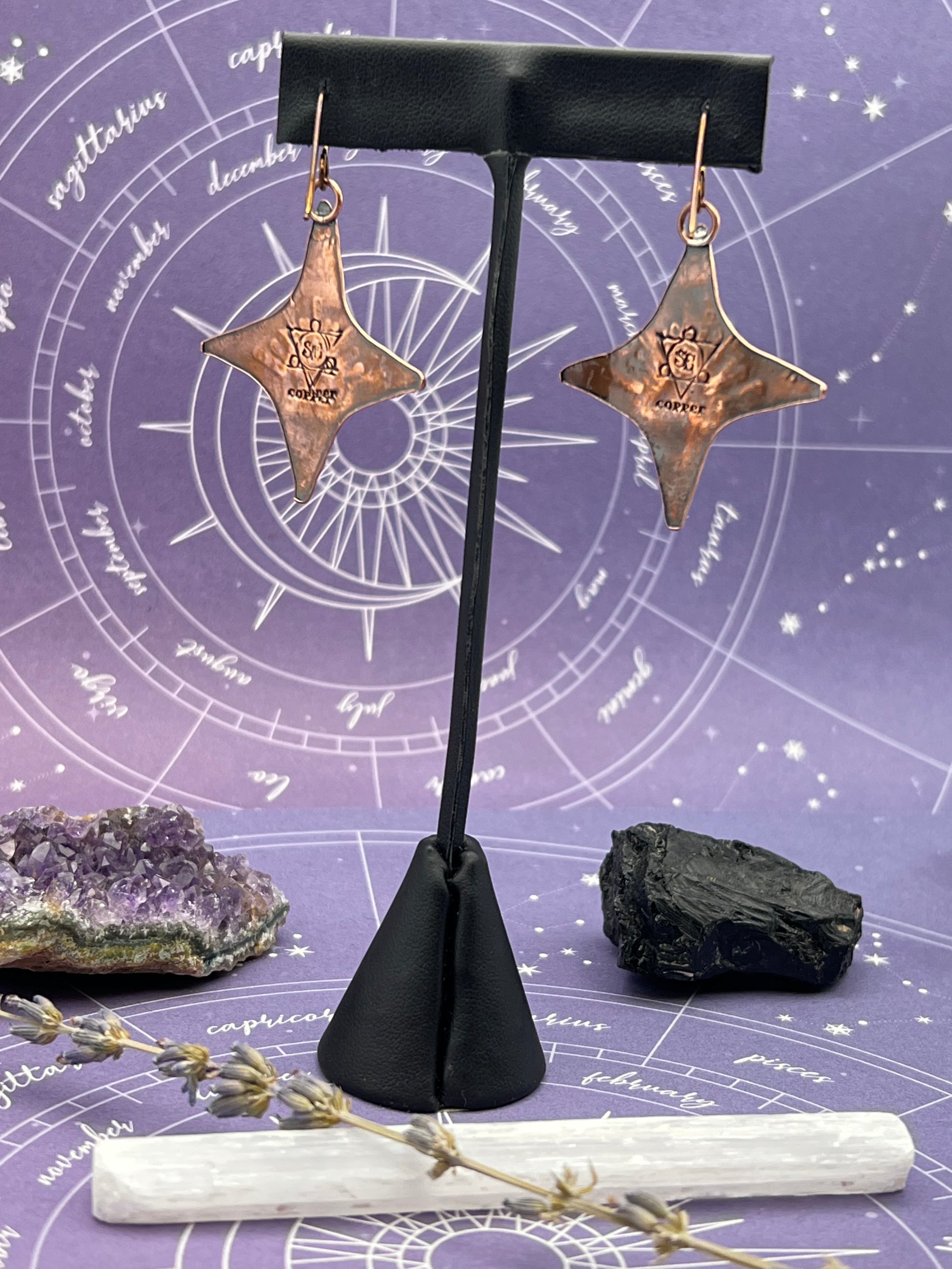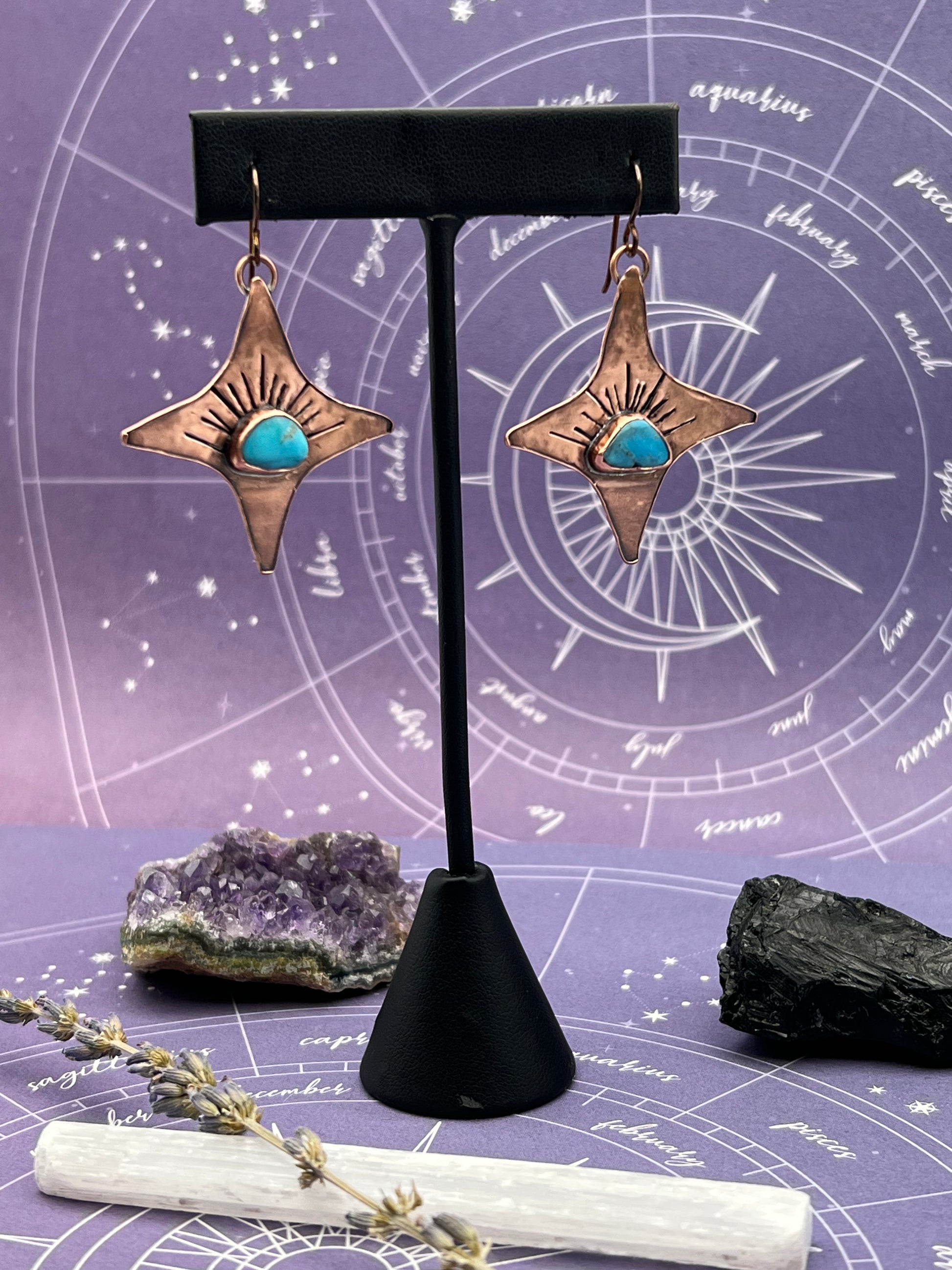 These earrings are handcrafted from pure copper that is sealed in a clear coat. The earring hooks are made of hypoallergenic niobium. They feature beautiful turquoise cabochons, and hang 2 inches long.