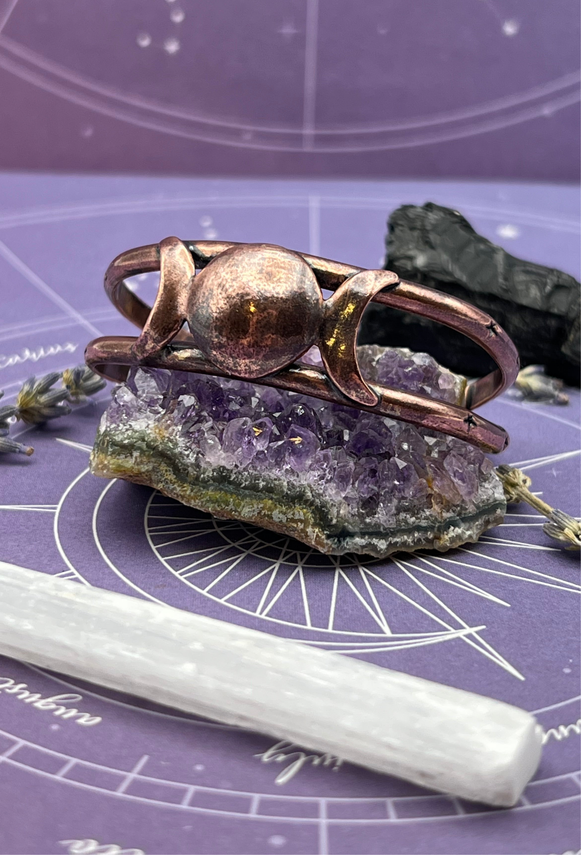 This bracelet is formed from solid copper, featuring the triple moon sign, with hand stamped star details. The copper has been antiqued, and finished with a clear lacquer to prevent patina and skin reactions.