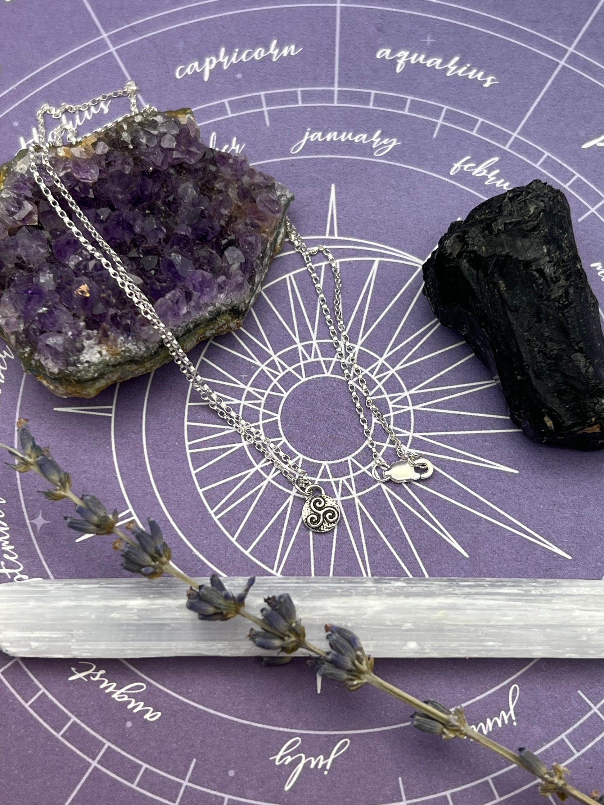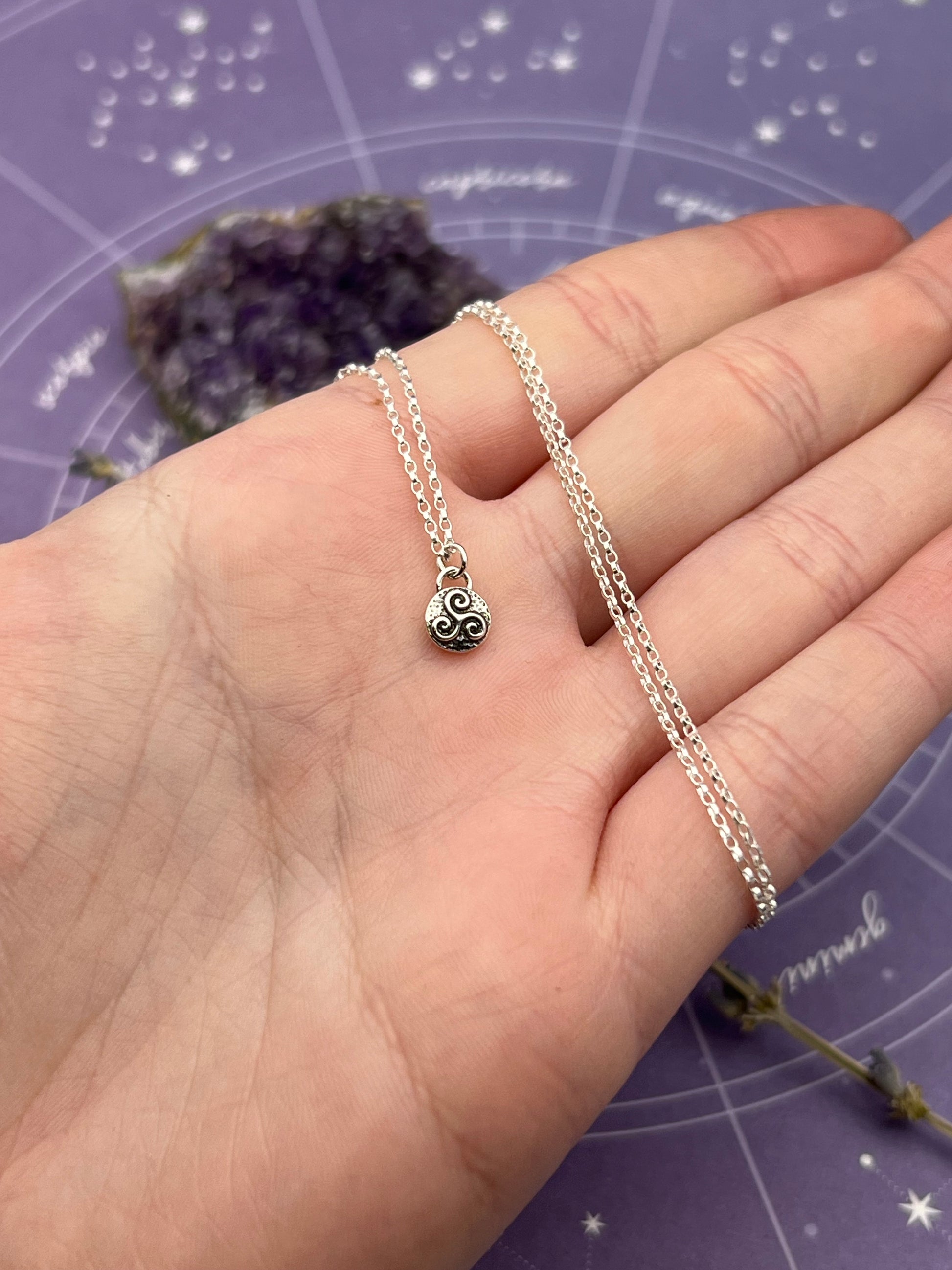 This necklace features the triskelion talisman in sterling silver hanging on an 18 inch sterling silver chain. The amulet pendant is about 1/4 inch.