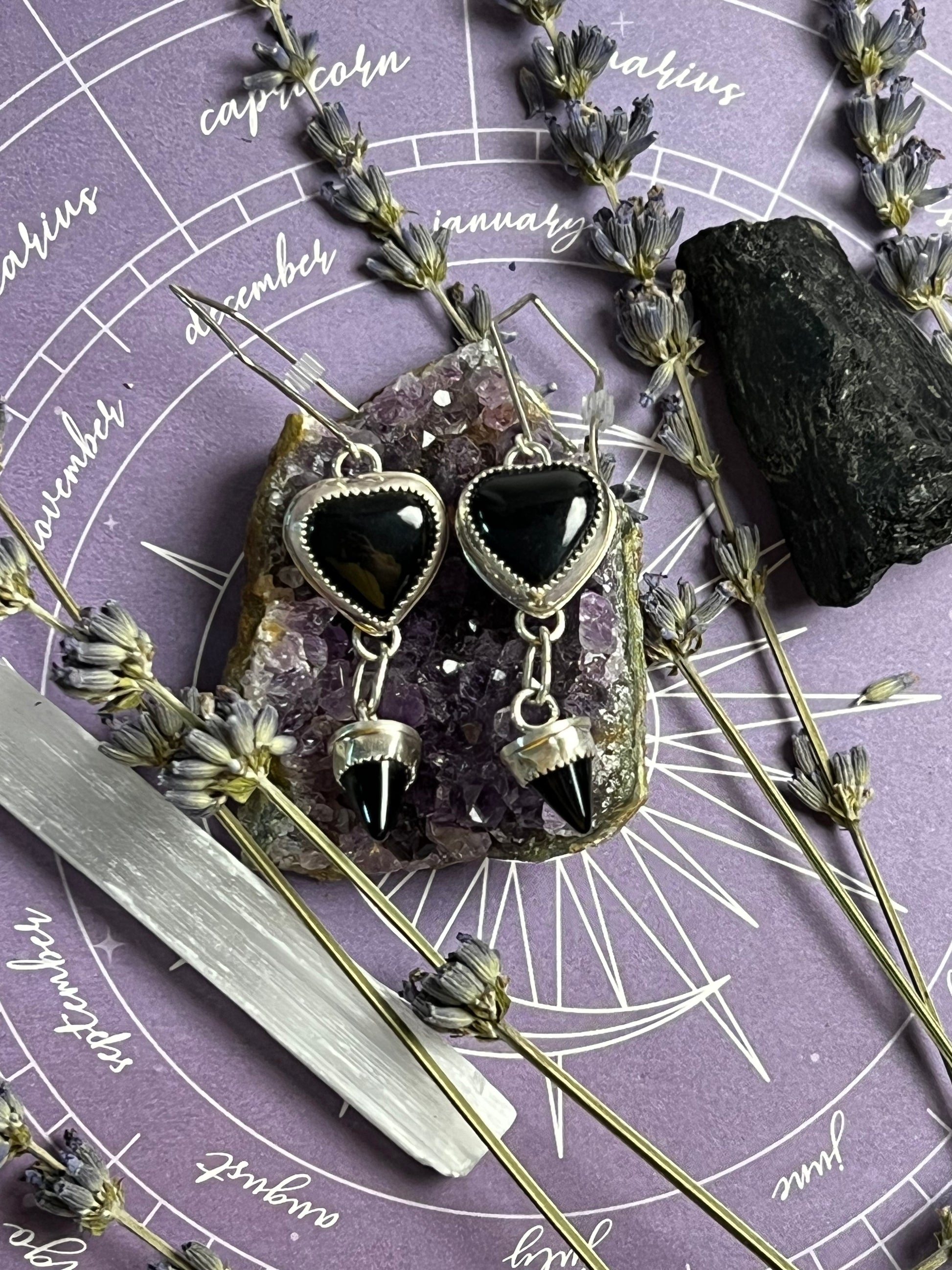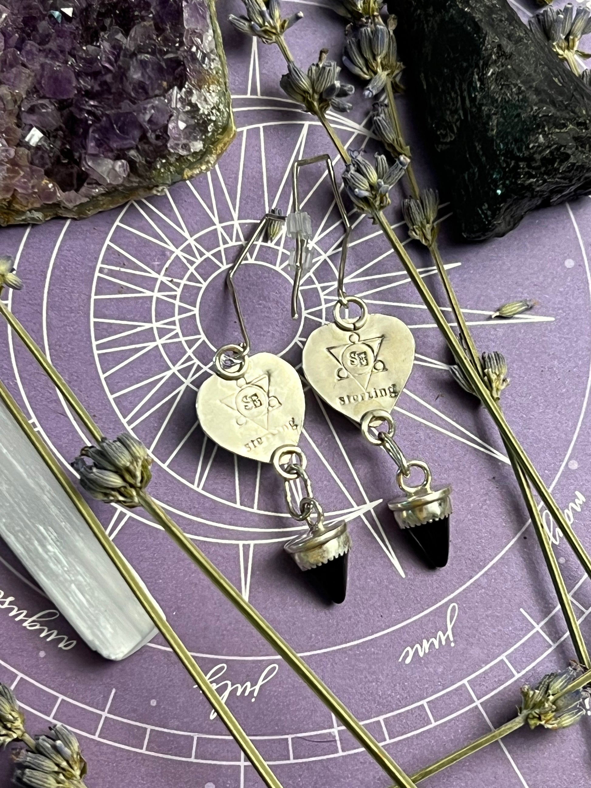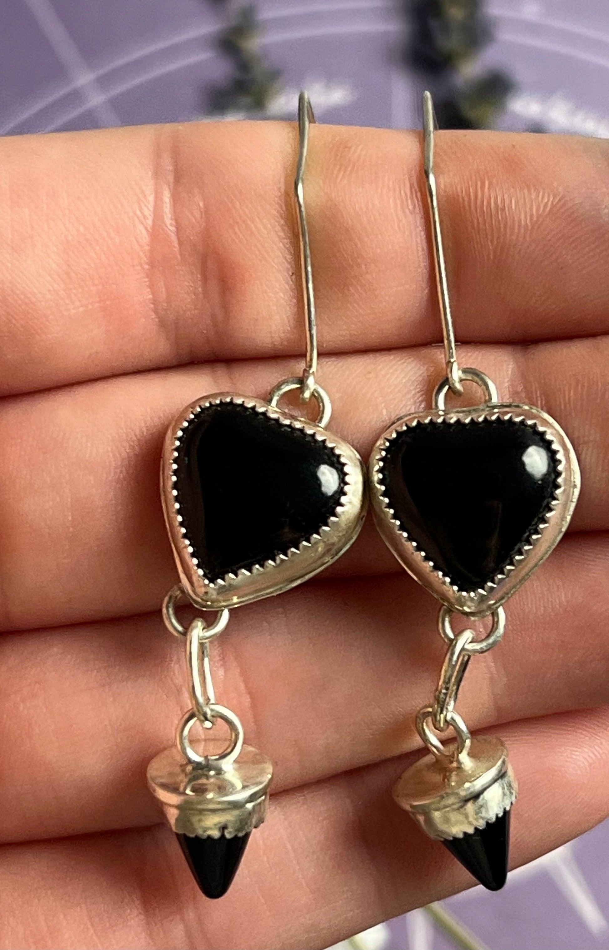 The earrings feature a black onyx heart and "thorn". The earrings hang 2 5/8 inches long.